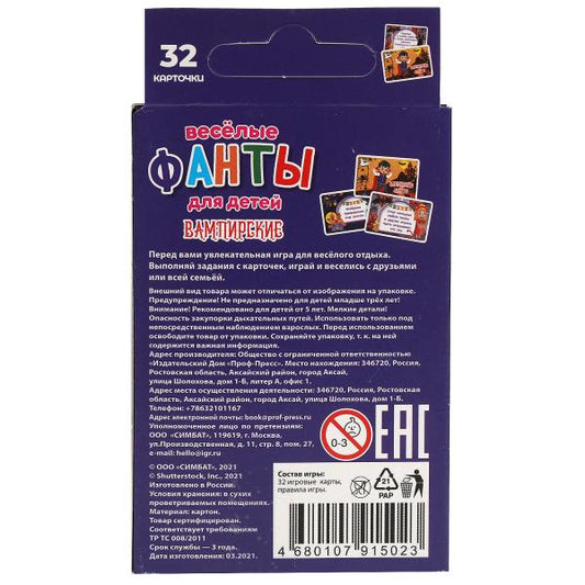 Вампирские. Веселые фанты для детей. Коробка с европодвесом, 32 карточки. Умные игры в кор.150шт