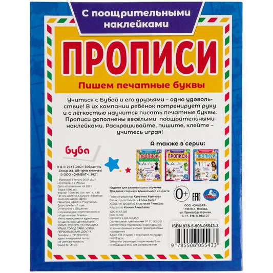 978-5-506-05543-3 Пишем печатные буквы. Прописи с поощрительными наклейками. Буба 165х210мм. 16 стр.