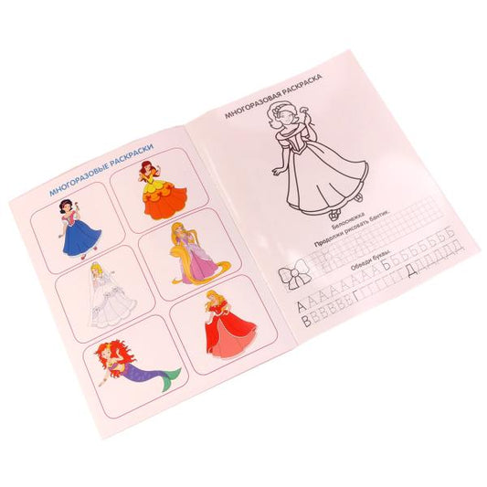 "УМКА". ПРИНЦЕССЫ (МНОГОРАЗОВЫЕ РАСКРАСКИ С ПРОПИСЯМИ) ФОРМАТ: 200Х260ММ. 12 СТР+ПЛЕНКА в кор.50шт.