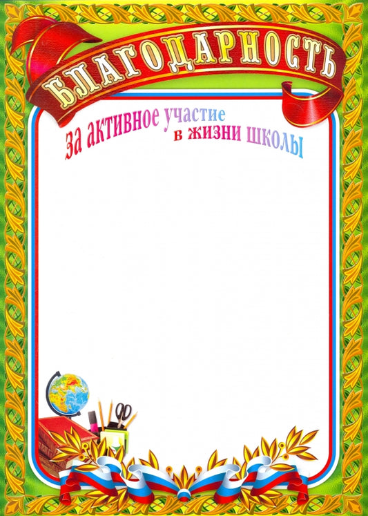 Благодарность за активное участие в жизни школы. (Формат А4, бумага мелованная пл 250)