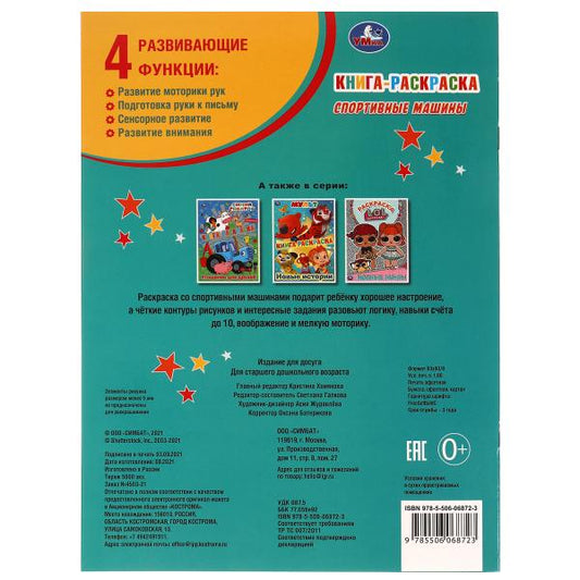 Спортивные машины. Книга раскраска. 214х290 мм, 16 стр. 1+1 Умка в кор.50шт