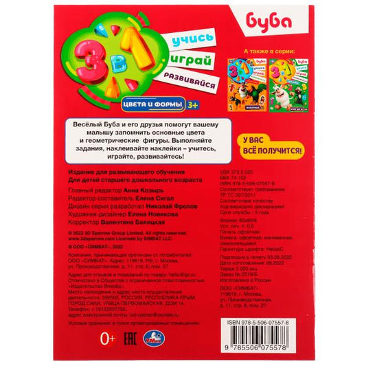Цвета и формы. Буба. Учись! Играй! Развивайся! 3 в1 + наклейки!. 210х285мм. 8стр. Умка в кор.50шт