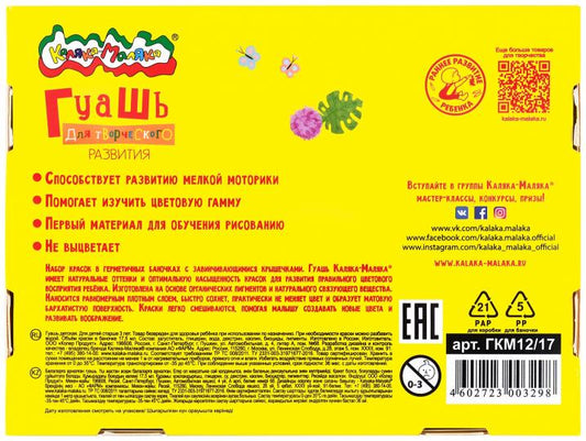 Гуашь Каляка-Маляка 17,5 мл 12 цв. 3+