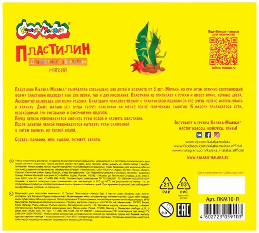 Пластилин Каляка-Маляка для детского творчества 10 цв. 150 г со стеком 3+