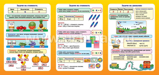 Решение текстовых задач. Математика. Задачи на стоимость, движение, производительность (работу): 9 секций. (Размер 280х200, картон макулатурный пл. 350)