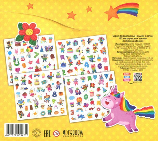 Многоразовые наклейки в папке. С Днём Рождения! 150 шт. 23,5х21,5 см. ГЕОДОМ