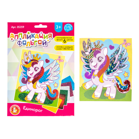 Набор для творчества. Аппликация фольгой "Единорог" размер 138х165 мм (конверт, 6 цв)