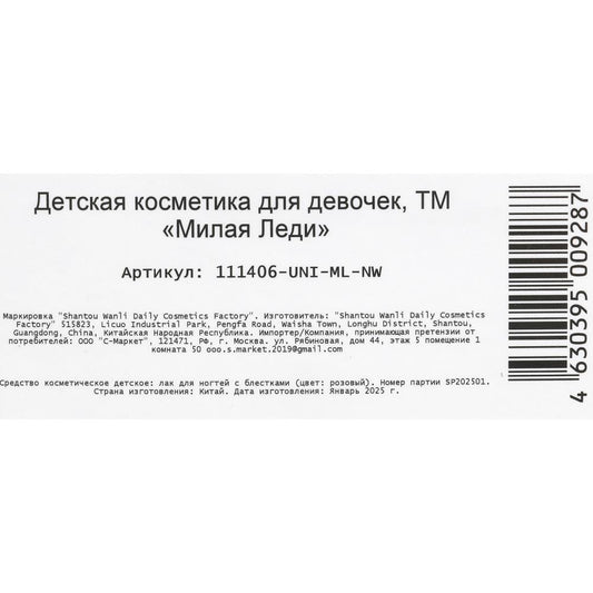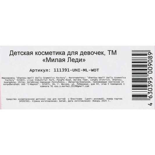 Косметика ДЛЯ ДЕВОЧЕК лак для ногтей с блестками МИЛАЯ ЛЕДИ в кор.4*30шт