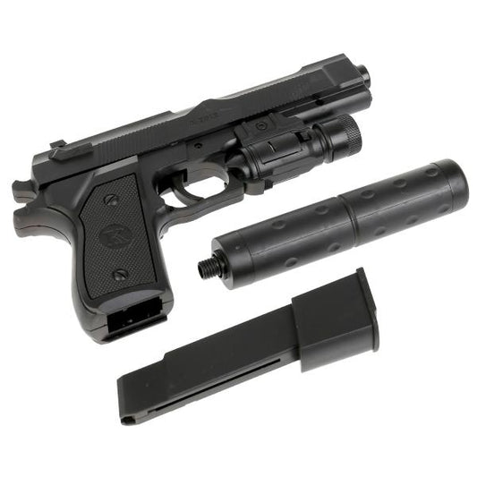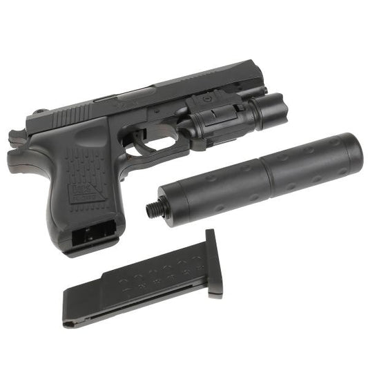 Пистолет (п) с лазер. прицелом, с фонариком, с глушителем, с пульками K2119 в пак. в кор.2*72шт