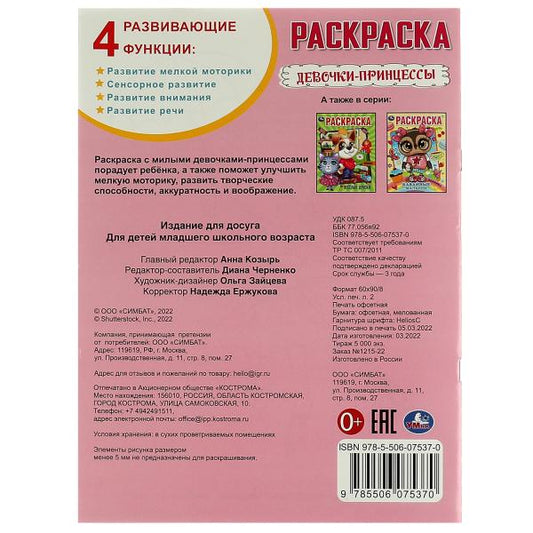 Девочки-принцессы. Раскраска А4. 214х290 мм. Скрепка. 16 стр. Умка в кор.50шт