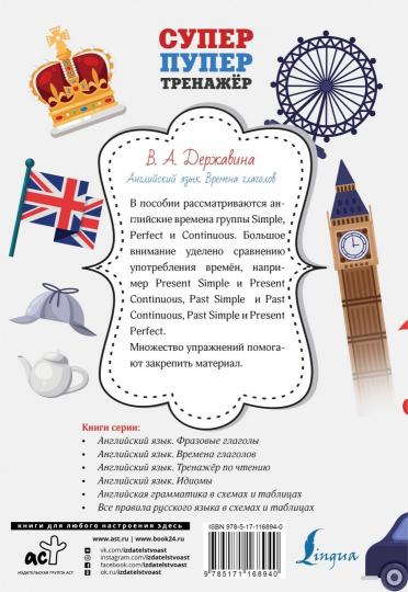 Handling time: 14 days В пособии рассматриваются английские времена группы Simple, Perfect и Continuous. Большое внимание уделено сравнению употребления времен, так как именно выбор временной формы часто вызывает трудности у изучающего английский язык. Сопоставляется употребление Present Simple и Present Continuous, Past Simple и Past Continuous, Present Perfect и Present Perfect Continuous, Past Simple и Present Perfect. Отдельно разбираются вспомогательные глаголы – to be, to have, to do. Большое количество упражнений помогает закрепить материал и постепенно достичь автоматизма в выборе времени. Издание предназначено для всех, кто учит английский язык.