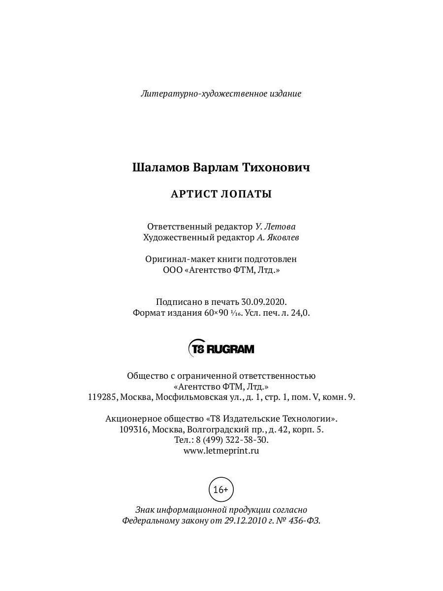 Handling time: 19 days Аннотация к книге "Артист лопаты. Рассказы" Шаламов В. Т.:Трудом жизни В.Т. Шаламова считается цикл рассказов и очерков «Колымские рассказы», повествующий о жизни советских заключенных, состоящий из шести сборников рассказов и очерков («Колымские рассказы», «Левый берег», «Артист лопаты», «Очерки преступного мира», «Воскрешение лиственницы» и «Перчатка, или КР-2»). В.Т. Шаламов настаивал, что цельными произведениями являются именно сборники с сохранением порядка, в котором расположены рассказы. В эту книгу вошел авторский сборник «Артист лопаты». Читать дальше…