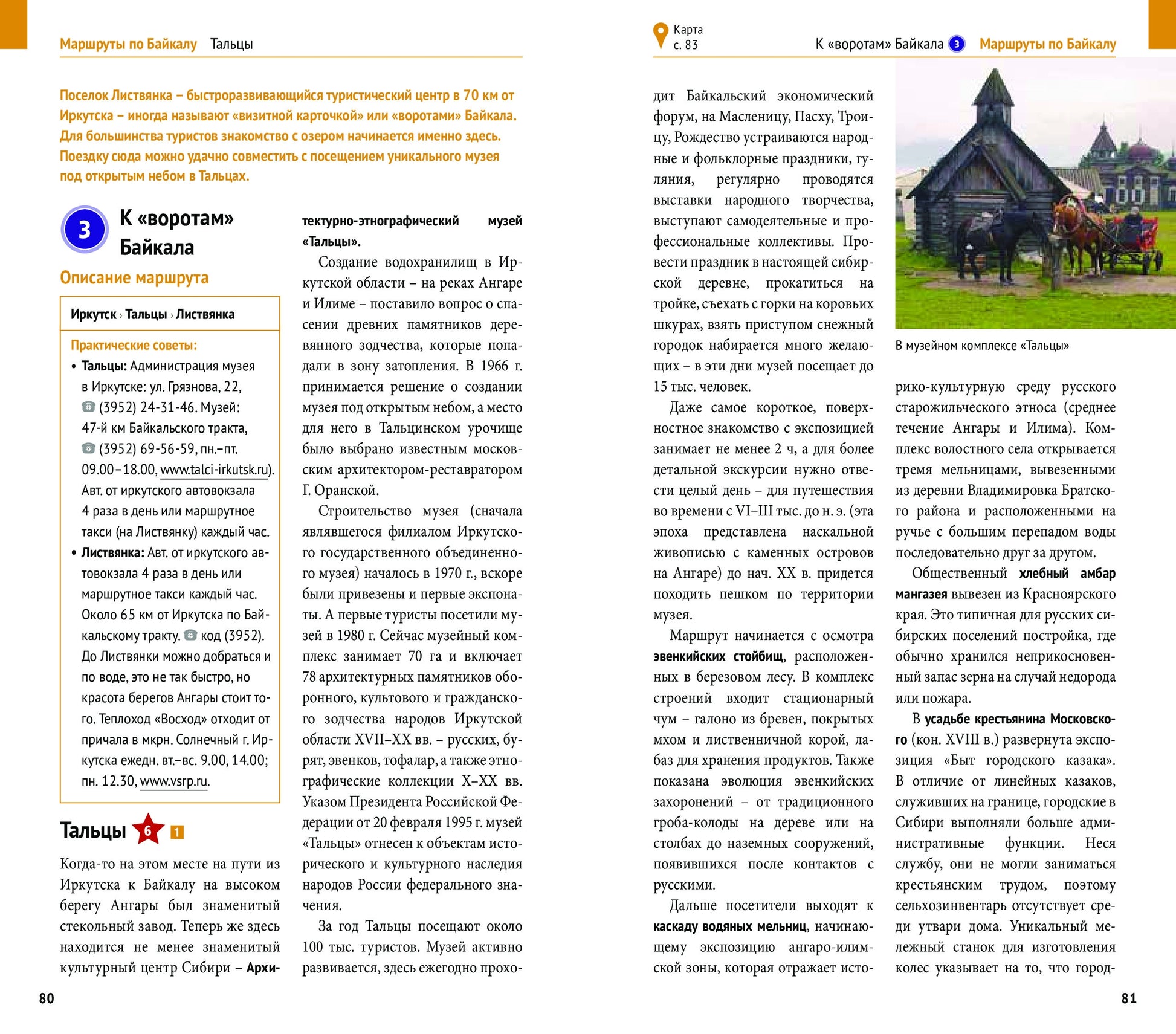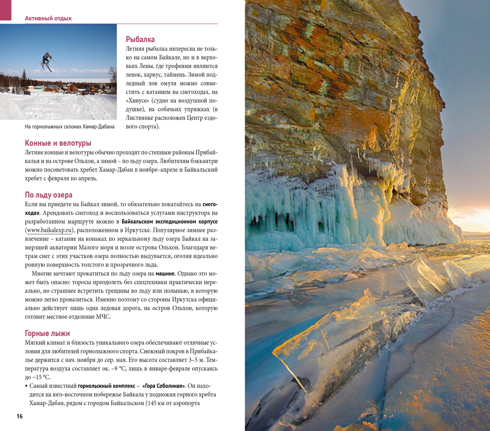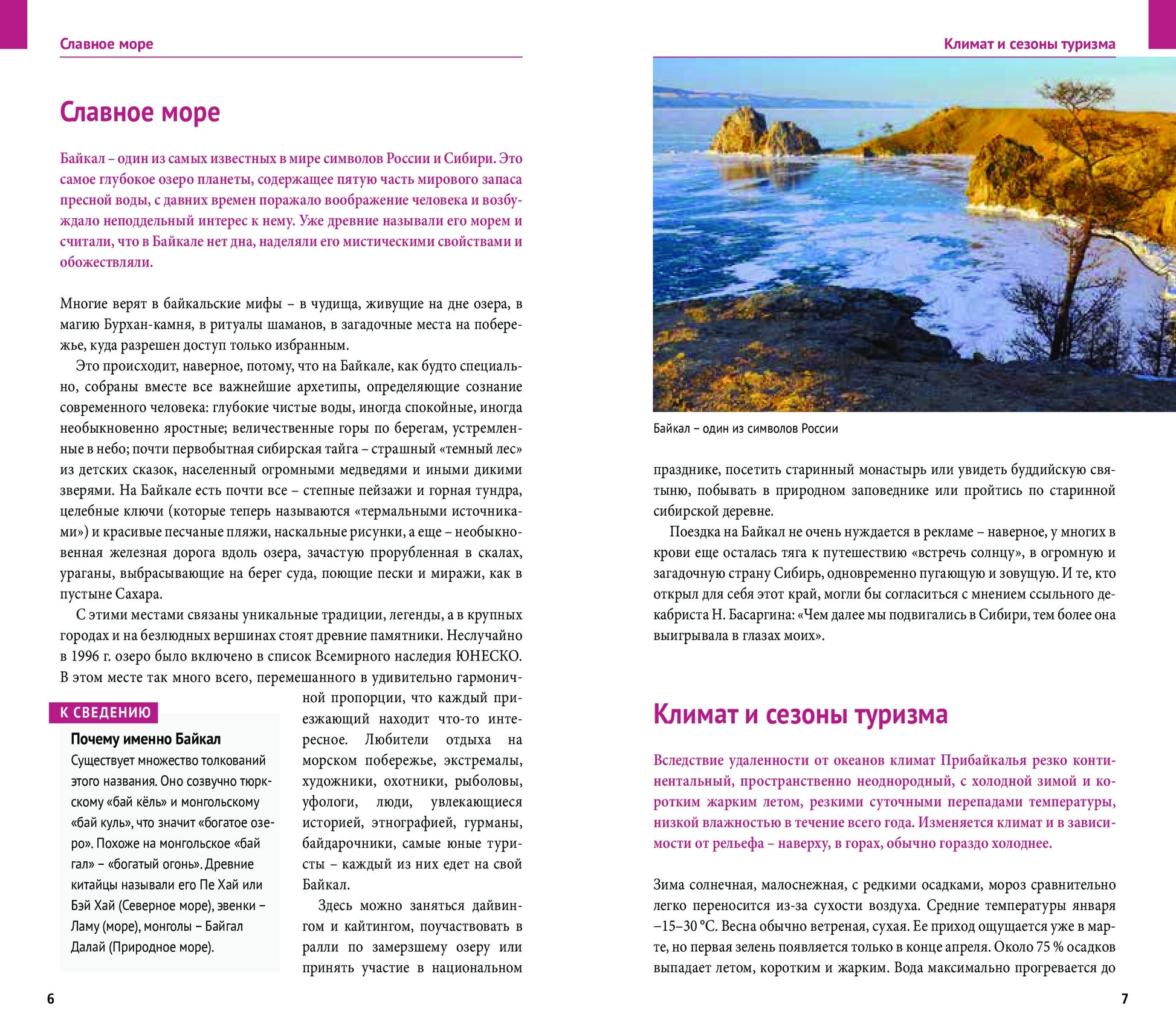 «Славное море, священный Байкал» - слова этого романса слышал каждый, ну почти каждый! Об этом древнем озере сложено немало песен и сказаний. Это самое большое пресноводное озеро в мире и самое глубокое (в среднем 745 м, а максимальная его глубина достигает 1642 м), образовавшееся в результате тектонических сдвигов. Отдыхать на Байкале можно круглый год. Летом – купаться и загорать на песчаных пляжах, совмещая «ничегонеделание» с осмотром достопримечательностей в Иркутске и Улан-Удэ. В августе-сентябре ловить рыбу, любоваться великолепными пейзажами, ходить в пешие походы. Зимой кататься на коньках и бродить среди ледяных пещер и скульптур, созданных самой природой, ведь даже лед здесь уникальный! Ему нет равных по прозрачности, толщине и другим показателям. Появляется он в конце декабря/ январе, а тает только в конце мая. Если свободное время появилось в феврале, постарайтесь попасть на празднование Нового года по лунному календарю – это лучшее время для знакомства с буддийскими храмовыми комплексами (дацанами). А еще в Иркутске обязательно сфотографируйтесь у памятника Бабру (а из путеводителя узнайте, кто это!), а в Улан-Удэ побывайте в буддийском центре России; в Листвянке попробуйте байкальского омуля, а в Тальцах узнайте о быте коренных народов Прибайкалья. Если останется время, полюбуйтесь истоком Ангары – единственной вытекающей реки из Байкала, и, если останется время , пройдите по Большой байкальской тропе. А еще, благодаря путеводителю вы узнаете много интересного о бухте Песчаной, ставшей давно местным туристическим брендом, подготовитесь к путешествию по Кругобайкальской железной дороге, или решите отправиться на знаменитый остров Ольхон – одно из мест силы на Земле, которое буряты называют «сердцем Байкала». Это и многое другое ждёт путешественника в этих уникальных местах!