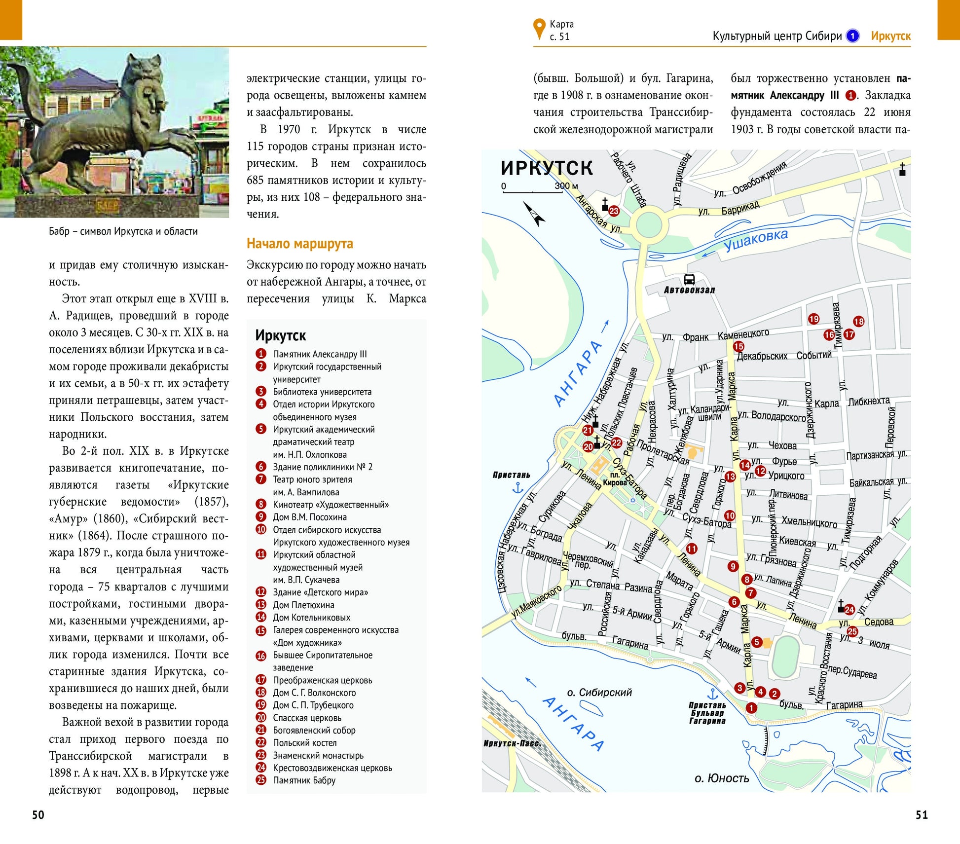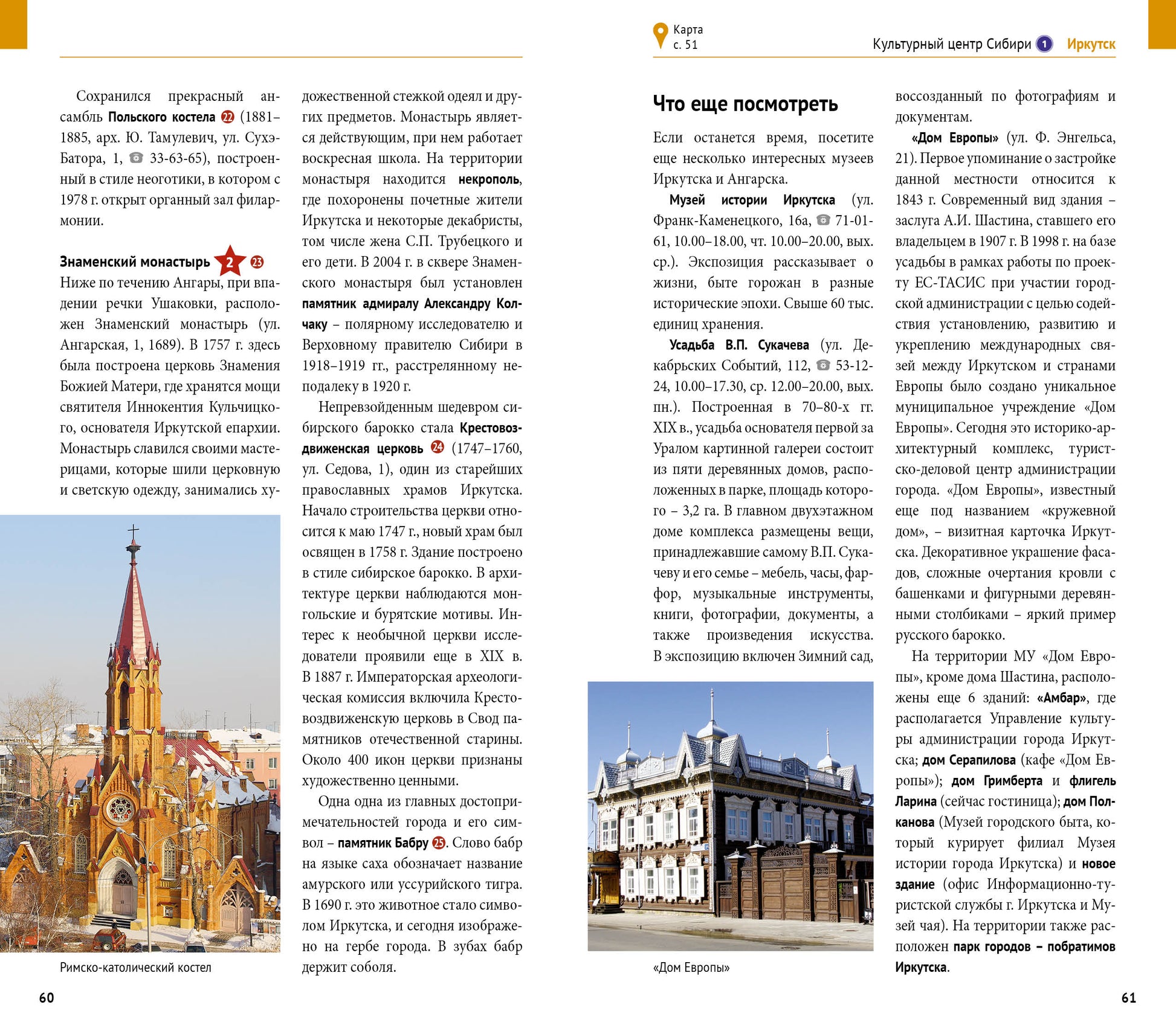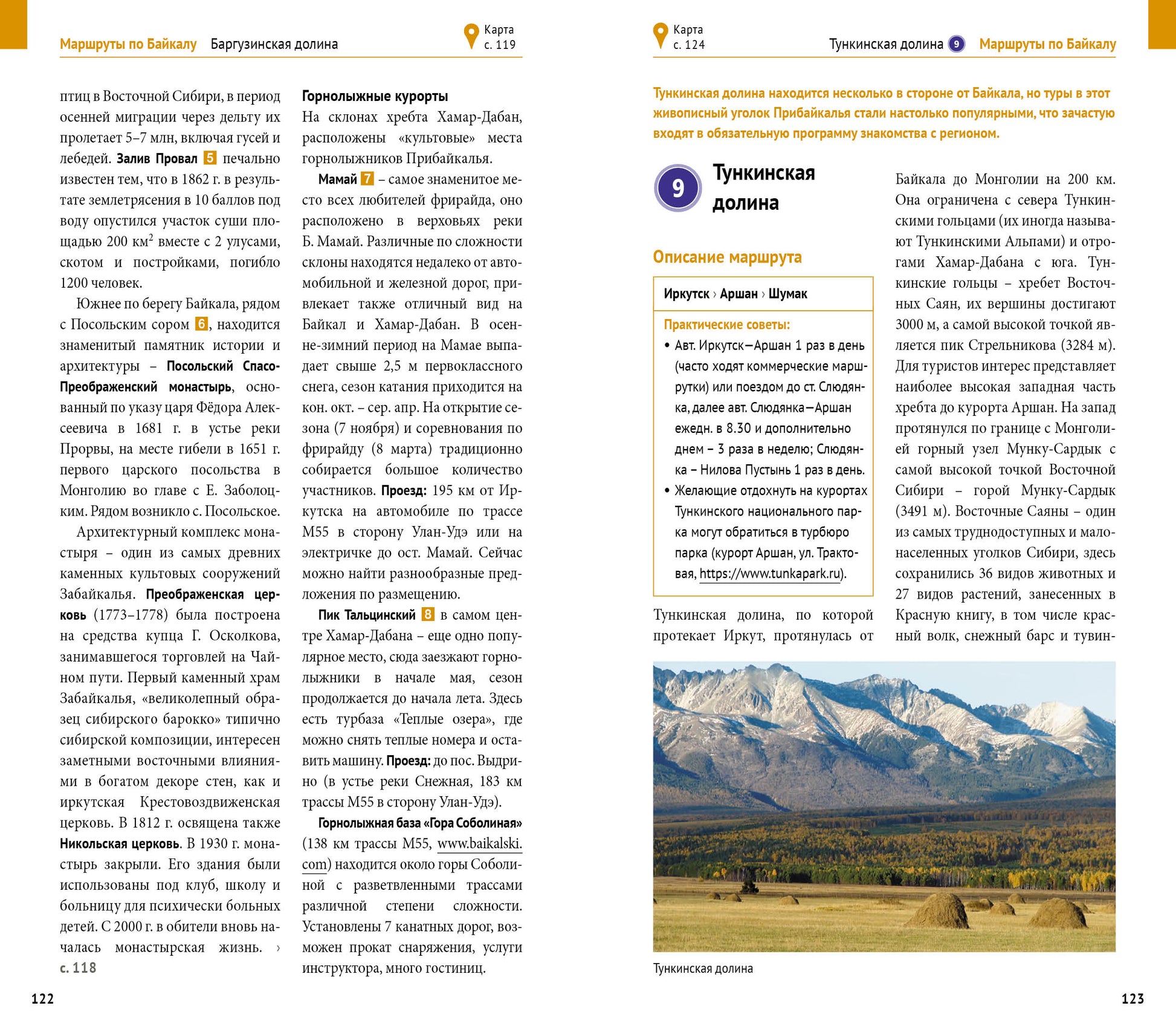 «Славное море, священный Байкал» - слова этого романса слышал каждый, ну почти каждый! Об этом древнем озере сложено немало песен и сказаний. Это самое большое пресноводное озеро в мире и самое глубокое (в среднем 745 м, а максимальная его глубина достигает 1642 м), образовавшееся в результате тектонических сдвигов. Отдыхать на Байкале можно круглый год. Летом – купаться и загорать на песчаных пляжах, совмещая «ничегонеделание» с осмотром достопримечательностей в Иркутске и Улан-Удэ. В августе-сентябре ловить рыбу, любоваться великолепными пейзажами, ходить в пешие походы. Зимой кататься на коньках и бродить среди ледяных пещер и скульптур, созданных самой природой, ведь даже лед здесь уникальный! Ему нет равных по прозрачности, толщине и другим показателям. Появляется он в конце декабря/ январе, а тает только в конце мая. Если свободное время появилось в феврале, постарайтесь попасть на празднование Нового года по лунному календарю – это лучшее время для знакомства с буддийскими храмовыми комплексами (дацанами). А еще в Иркутске обязательно сфотографируйтесь у памятника Бабру (а из путеводителя узнайте, кто это!), а в Улан-Удэ побывайте в буддийском центре России; в Листвянке попробуйте байкальского омуля, а в Тальцах узнайте о быте коренных народов Прибайкалья. Если останется время, полюбуйтесь истоком Ангары – единственной вытекающей реки из Байкала, и, если останется время , пройдите по Большой байкальской тропе. А еще, благодаря путеводителю вы узнаете много интересного о бухте Песчаной, ставшей давно местным туристическим брендом, подготовитесь к путешествию по Кругобайкальской железной дороге, или решите отправиться на знаменитый остров Ольхон – одно из мест силы на Земле, которое буряты называют «сердцем Байкала». Это и многое другое ждёт путешественника в этих уникальных местах!
