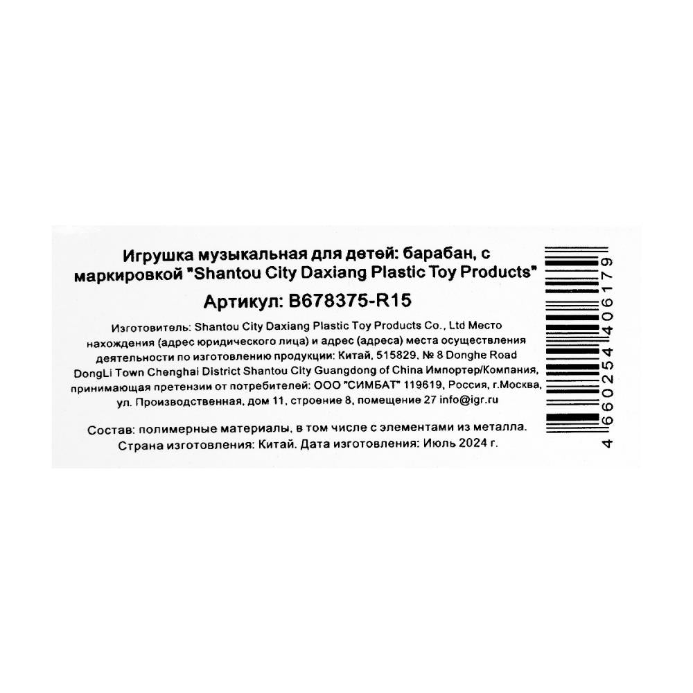 Игрушка "Барабан принцессы, в пак.24,5*17*10см - в кор.2*36шт". Taux : 0,273.