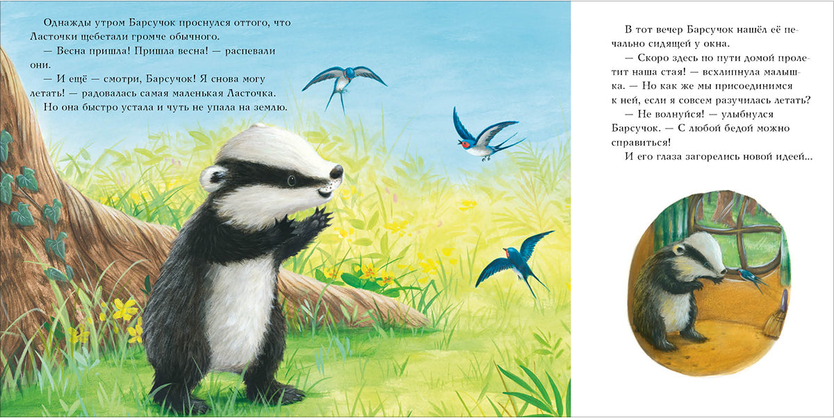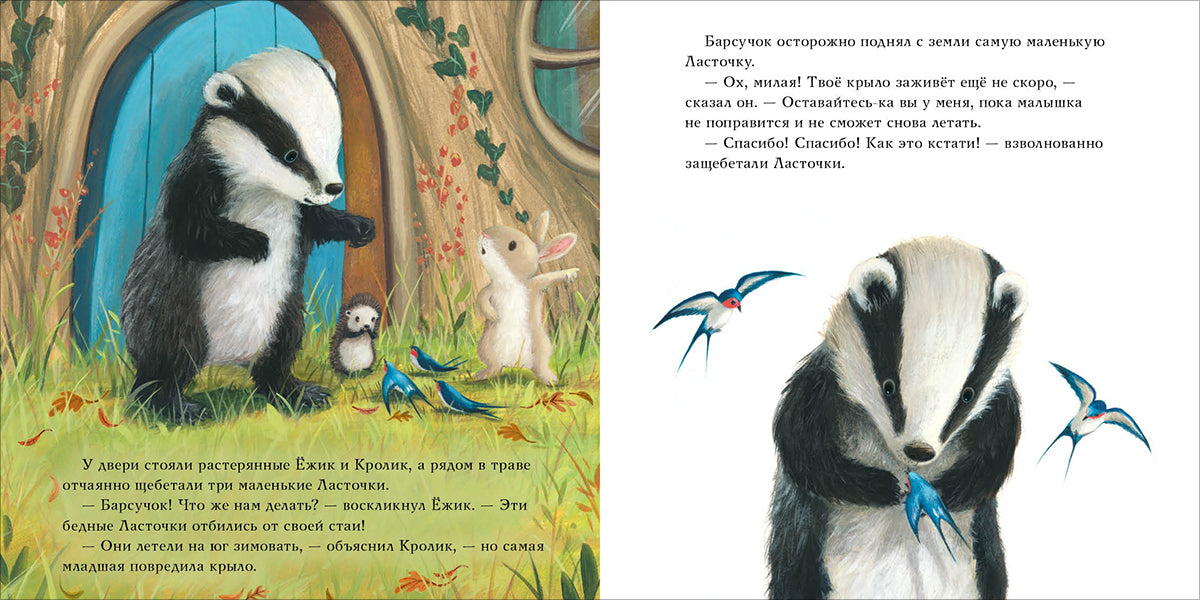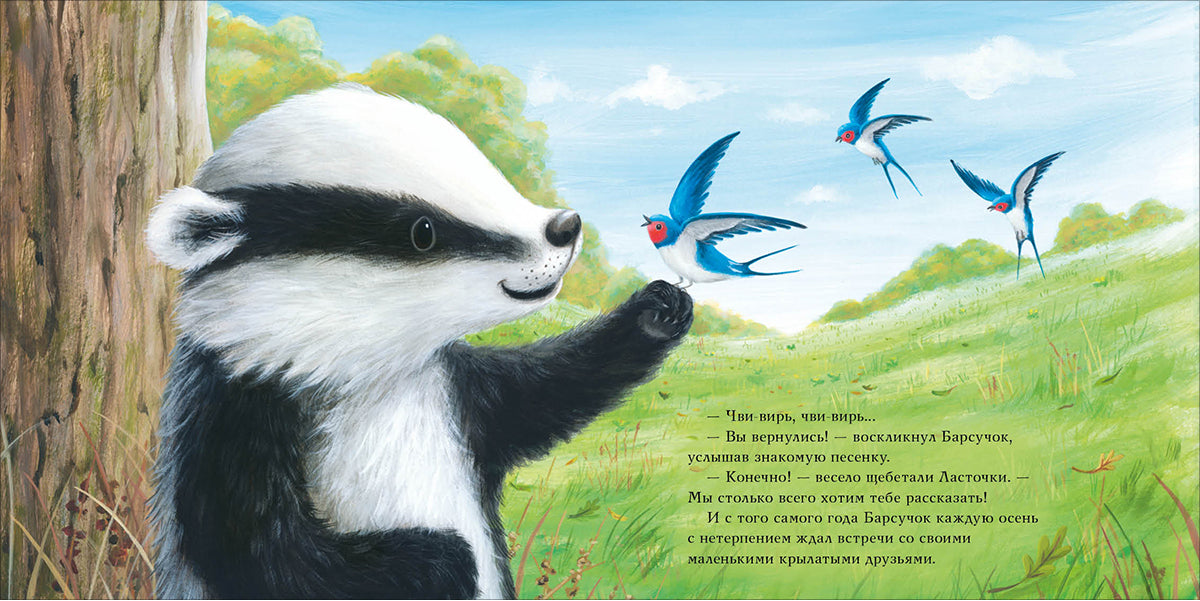 Handling time: 14 days Барсучок и большая птица. Чью С. Каждый житель леса знает доброго и отзывчивого Барсучка. Он всегда придёт на помощь и поможет в трудную минуту. Сегодня в беду попали маленькие ласточки: они летели зимовать на юг, но одна из них повредила крыло? К счастью, Барсучок готов приютить путешественниц до весны! Новые друзья замечательно проводят время вместе, ласточка поправляется и теперь можно снова отправиться в путь. Но получится ли у них догнать свою стаю? И у Барсучка снова есть смелый план?