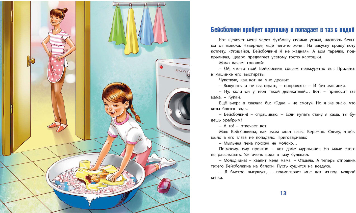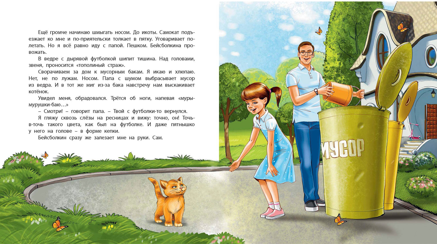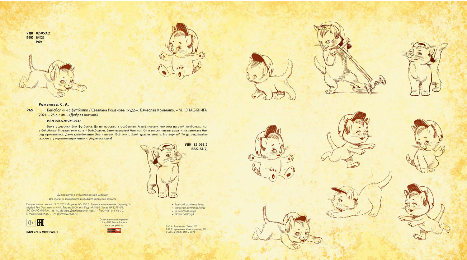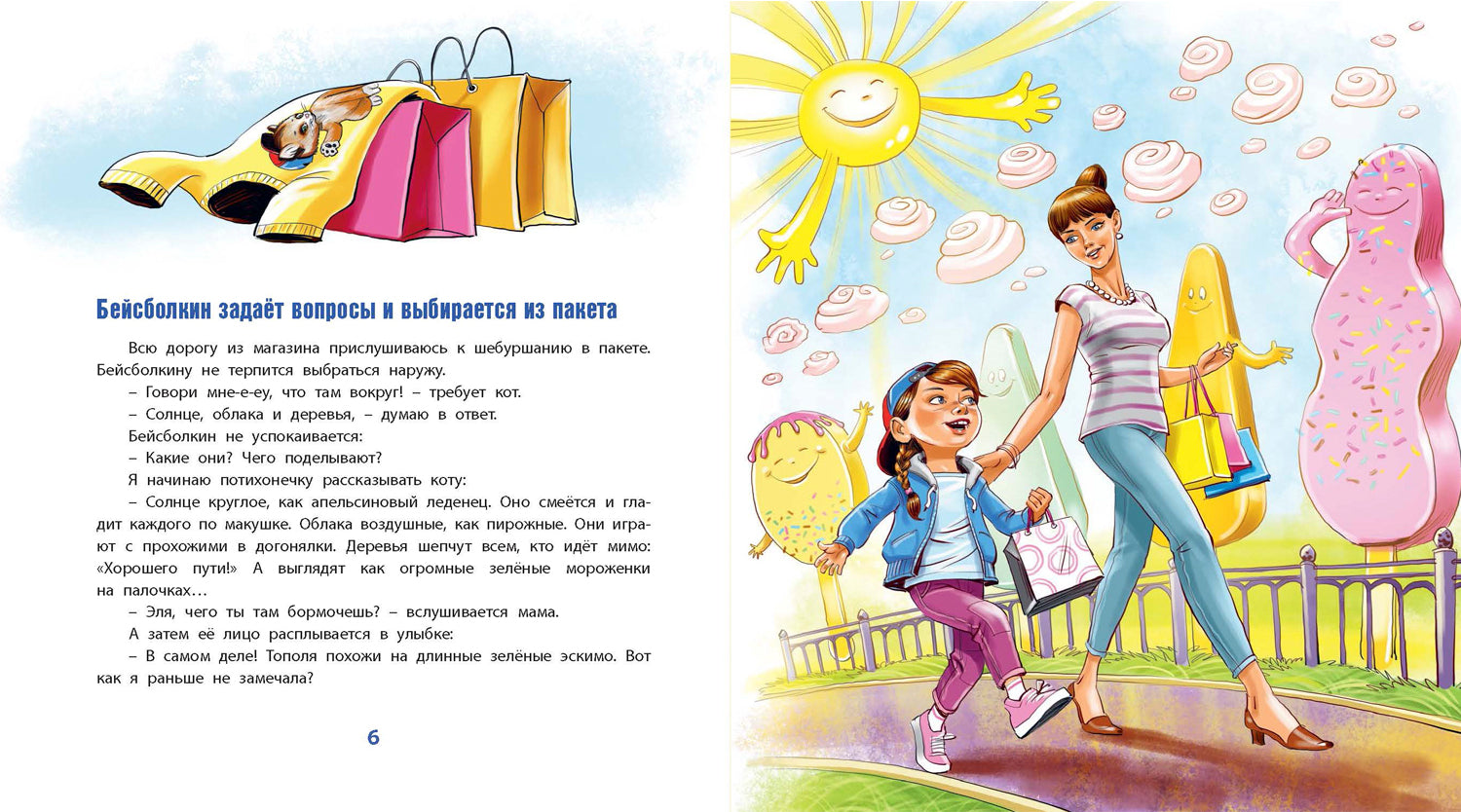 Бейсболкин с футболки. Романова С.А. Добрая книжка Была у девочки Эли футболка. Да не простая, а особенная. А всё потому, что жил на этой футболке... кот в бейсболке! И звали того кота – Бейсболкин. Замечательный был кот! Он и мысли читать умел, и на самокате был рад прокатиться. Даже колыбельные Эле напевал. Всё они с Элей делали вместе. Не верите? Тогда открывайте скорее эту удивительную книгу и убедитесь сами! Для старшего дошкольного и младшего школьного возраста. Художник Вячеслав Кривенко Переплет / 25 с. / Формат 235 × 260 мм