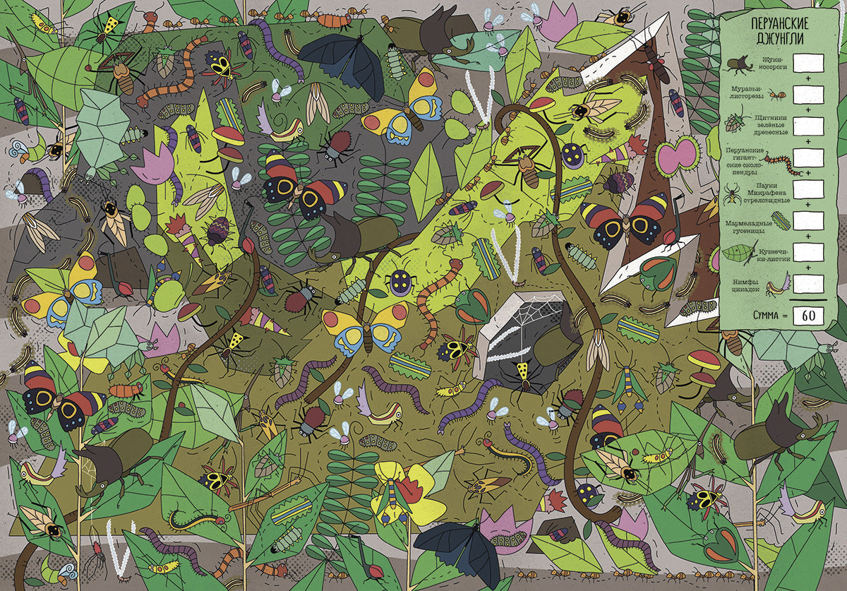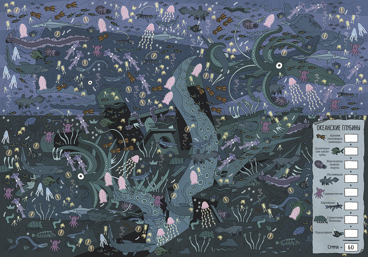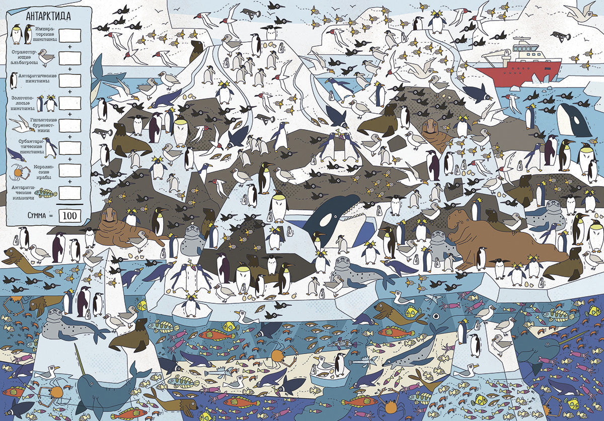 Тебе предстоит увлекательное путешествие: сафари по Африканской саванне, погружение в океанские глубины, поход через Гималаи. Ты узнаешь множество самых разных зверей, насекомых, рыб и птиц и о том, где они живут. Сосчитай и запиши всех животных, которых повстречаешь на своём пути!