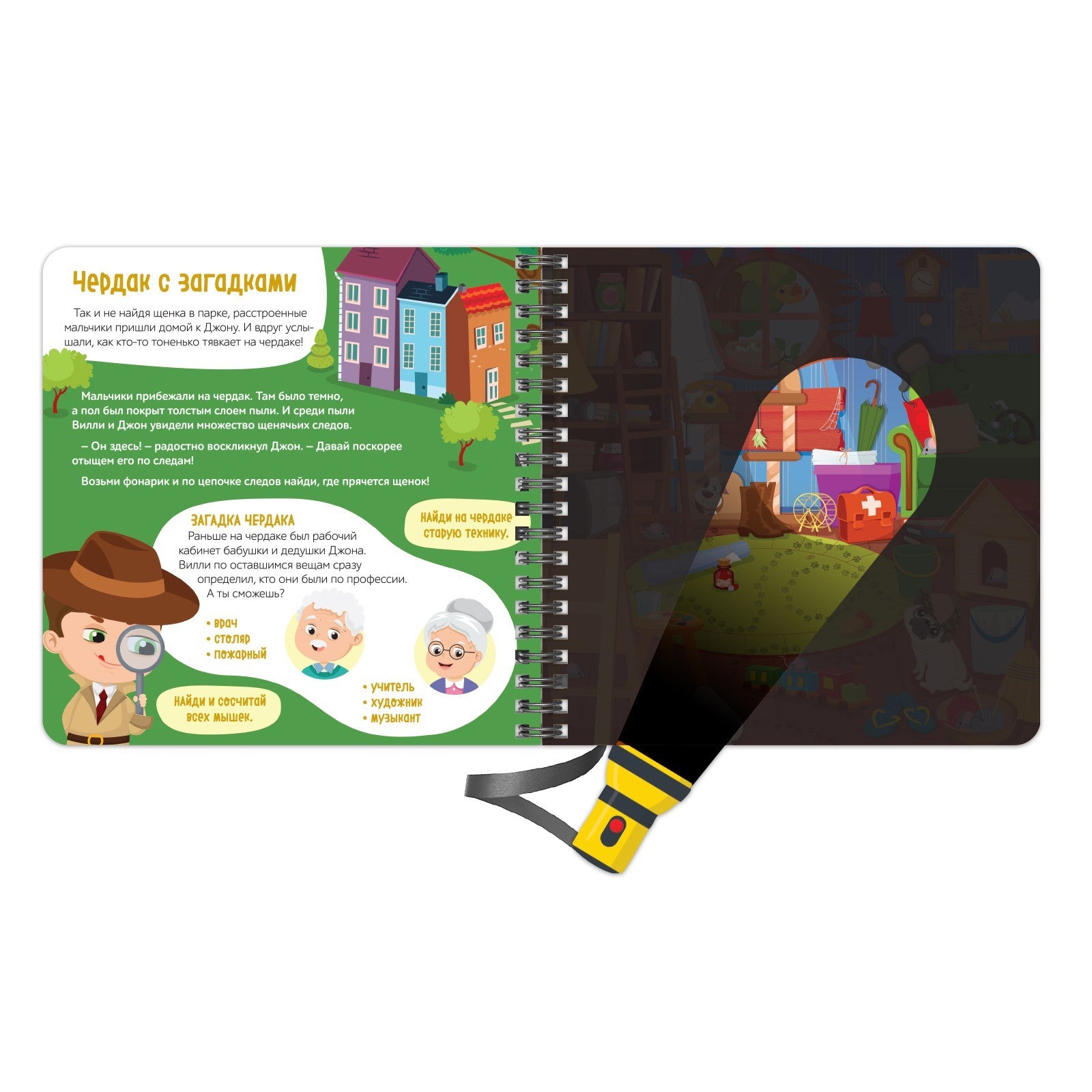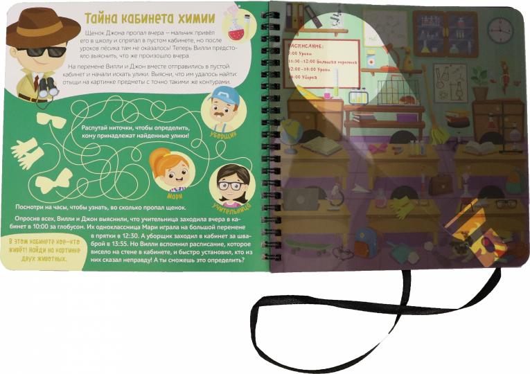 Хотите, чтобы ваш ребёнок почувствовал себя настоящий детективом? С Вилли это сделать проще простого. Этот дружелюбный мальчик предложит крохе сыграть с ним в интересную игру-расследование: отыскать потерявшуюся собаку и решить логические задачки!Для игры вам понадобится фонарик. Он выполнен из картона и привязан к книжке на шнурок.Как разглядеть предметы на чёрных страницах книжки?Возьмите фонарик и вложите его между пластиковой и чёрной страницами.Вы получите яркое изображение на пластиковой странице, где размещаете белую часть фонарика (луч).Остальные части страницы (не под фонариком) остаются в тени.Секретная книга с волшебным фонариком «Ведём расследование с Вилли» привлекает внимание ребёнка своей необычной задумкой.Познавательное пособие рекомендовано для детей старше 3 лет. Оно расширит кругозор малыша. Ребёнок подружится с весёлым мальчиком Вилли и узнает, какие вещи спрятались в его доме. Научится решать задачки-головоломки, считать предметы и с лёгкостью выходить из загадочных и запутанных историй.Возьмите фонарик, посветите им на страницу — вы откроете тайны животного мира!