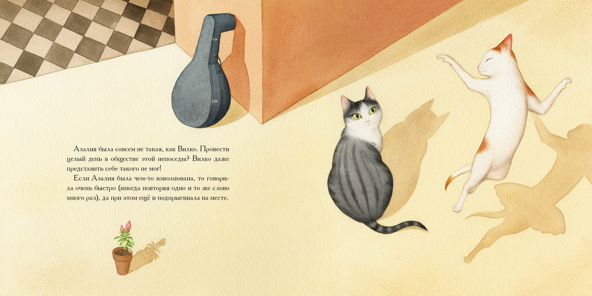 Handling time: 24 days В один замечательный летний день кот Вилко познакомился со своей кузиной Азалией. Сестрёнка оказалась совсем непохожей на него - шумной и непоседливой. У бедного кота голова шла кругом! Он просто мечтал хоть немного побыть в тишине и покое. А что, если подшутить над Азалией?.. Но долгожданное одиночество не обрадовало Вилко, а вскоре к грусти добавилась тревога. Как теперь исправить последствия неудачной шутки?..Об иллюстраторе:Бояна Дмитровски - иллюстратор и автор детских книг. Родилась и выросла в Белграде, после школы переехала в Канаду. Изучала цифровую иллюстрацию. Вернулась на родину, окончила Университет искусств в Белграде, переехала в Словению. В 2017 году её иллюстрации были номинированы на словенскую литературную премию, присуждаемую за достижения в области детской литературы. В 2019 году она была удостоена награды Hinko Smrekar Distinction на 13-й Биеннале словенской книжной иллюстрации в Любляне. С 2020 года живет и работает в Швеции.