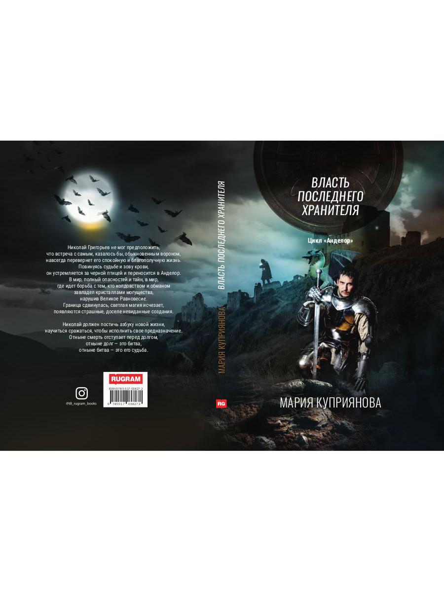 Handling time: 19 days Автор: Куприянова Мария, «Власть последнего хранителя»: Николай Григорьев не мог предположить, что встреча с самым, казалось бы, обыкновенным вороном, навсегда перевернет его спокойную и благополучную жизнь. Повинуясь судьбе и зову крови, он устремляется за черной птицей и переносится в Анделор. В мир, полный опасностей и тайн, в мир, где идет борьба с тем, кто колдовством и обманом завладел кристаллами могущества, нарушив Великое Равновесие. Граница сдвинулась, светлая магия исчезает, появляются страшные, доселе невиданные создания. Николаи должен постичь азбуку новой жизни, научиться сражаться, чтобы исполнить свое предназначение. Отныне смерть отступает перед долгом, отныне долг — это битва, отныне битва — это его судьба.