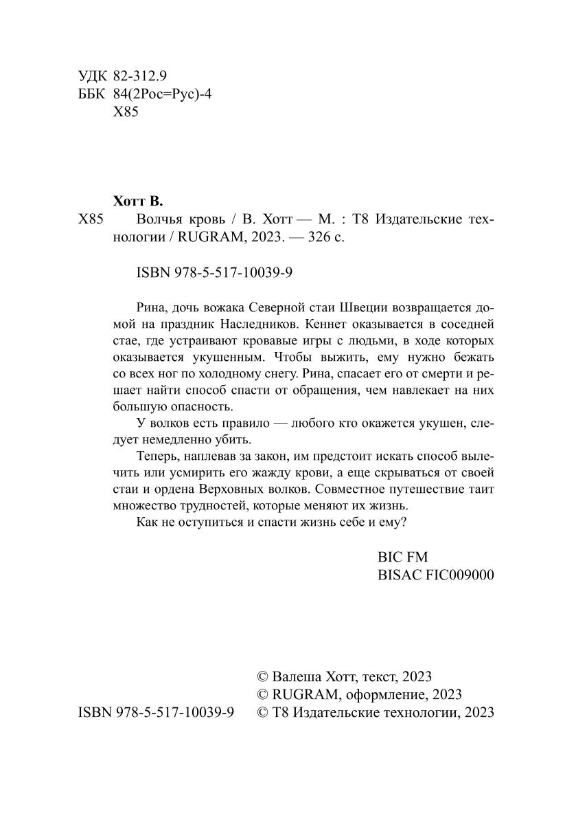 Handling time: 19 days Автор: Хотт Валеша, «Волчья кровь»: Рина, дочь вожака Северной стаи Швеции возвращается домой на праздник Наследников. Кеннет оказывается в соседней стае, где устраивают кровавые игры с людьми, в ходе которых оказывается укушенным. Чтобы выжить, ему нужно бежать со всех ног по холодному снегу. Рина, спасает его от смерти и решает найти способ спасти от обращения, чем навлекает на них большую опасность. У волков есть правило — любого кто окажется укушен, следует немедленно убить.
