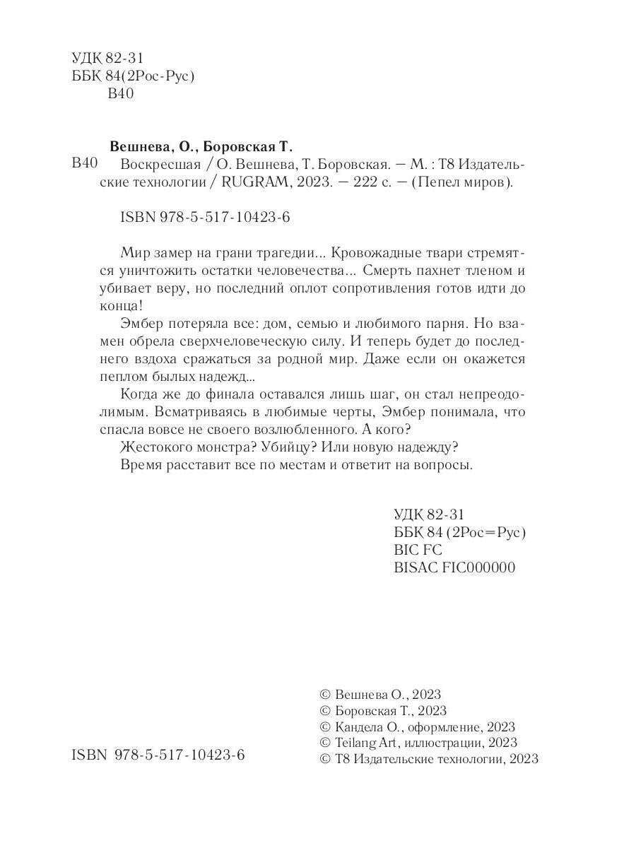 Handling time: 19 days Авторы: Вешнева Ольга, Боровская Татьяна, «Воскресшая»: Мир замер на грани трагедии... Кровожадные твари стремятся уничтожить остатки человечества... Смерть пахнет тленом и убивает веру, но последний оплот сопротивления готов идти до конца! Эмбер потеряла все: дом, семью и любимого парня. Но взамен обрела сверхчеловеческую силу. И теперь будет до последнего вздоха сражаться за родной мир. Даже если он окажется пеплом былых надежд… Когда же до финала оставался лишь шаг, он стал непреодолимым. Всматриваясь в любимые черты, Эмбер понимала, что спасла вовсе не своего возлюбленного. А кого? Жестокого монстра? Убийцу? Или новую надежду? Время расставит все по местам и ответит на вопросы.