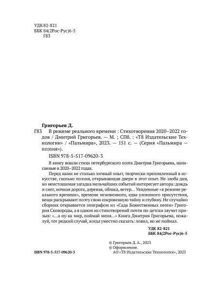 Handling time: 14 days Автор: Григорьев Д.А., «В режиме реального времени. Стихотворения 2020-2022 годов»: "В режиме реального времени" - книга стихов петербургского поэта и прозаика Дмитрия Григорьева, написанных в 2020–2022 годах. Книга создает ощущение продуваемости необычным ветром. Словно человек в легком пальто идет навстречу потоку бытия, которое, протекая сквозь него, обретает новые смыслы. Воздух становится прозрачнее, все видится четче и ярче. Алла Горбунова Григорьев склонен путать следы, творить реальность, вылавливать из нее мифы, благодаря чему самое обыденное и непритязательное легко преломляется в захватывающую фантасмагорию, а легкомысленная байка - в действенный манифест во имя радости и свободы. Анастасия Романова Вот о чем я хотел и, наверное, мог бы просить: "станцуй мне огонь... забинтуй эту долгую ночь", - неважно, будь это первым или (от сумы да от тюрьмы!) последним желанием. Хорошо, если друг уже нашел за тебя необходимые тебе слова. Сергей Морейно