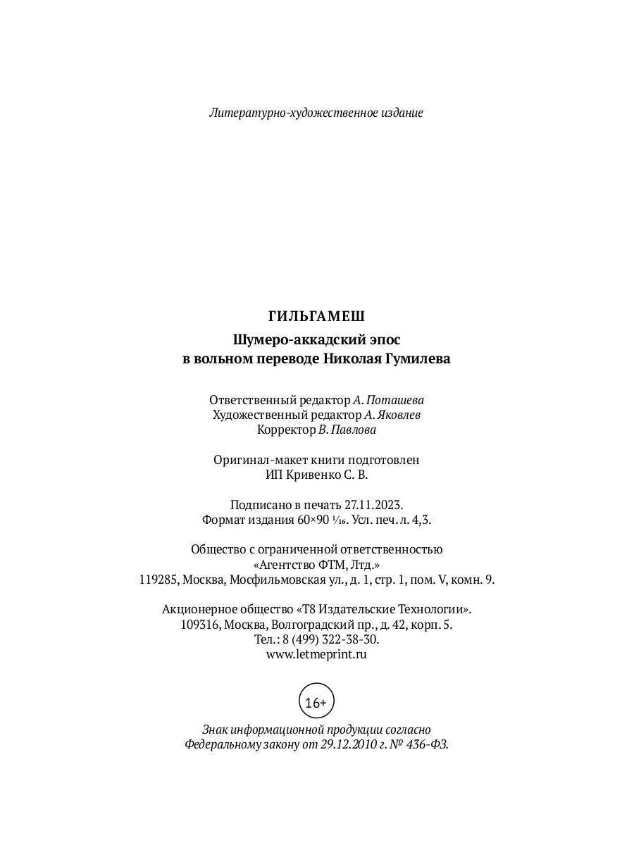 Handling time: 14 days «Гильгамеш. Шумеро-аккадский эпос в вольном переводе Николая Гумилева»: В 1918 году Николай Гумилев впервые перевел на русский язык «Эпос о Гильгамеше» - шумеро-аккадский литературный памятник, создание которого исследователи относят ко II тысячелетию до н. э. Взяв за основу вышедший в 1907 году французский перевод востоковеда-семитолога Э. П. Дорма, консультируясь с русским шумерологом В. К. Шилейко, Гумилев позволил себе весьма вольно обращаться с текстом: опираясь на свое поэтическое чутье, устранить лакуны, ввести ритм, но лишь для того, чтобы «изумительно-прекрасная поэма о Гильгамеше» стала «достоянием всех, а не только узких специалистов». Настоящее издание снабжено также предисловием переводчика и введением В. К. Шилейко.