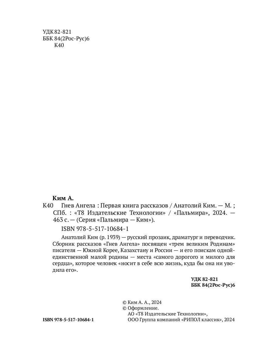 Handling time: 19 days Автор: Ким А.А., «Гнев Ангела. Первая книга рассказов»: Анатолий Ким (р. 1939) - русский прозаик, драматург и переводчик. Сборник рассказов «Гнев Ангела» посвящен «трем великим Родинам» писателя - Южной Корее, Казахстану и России - и его поискам одной-единственной малой родины - места «самого дорогого и милого для сердца», которое человек «носит в себе всю жизнь, куда бы она ни уводила его».