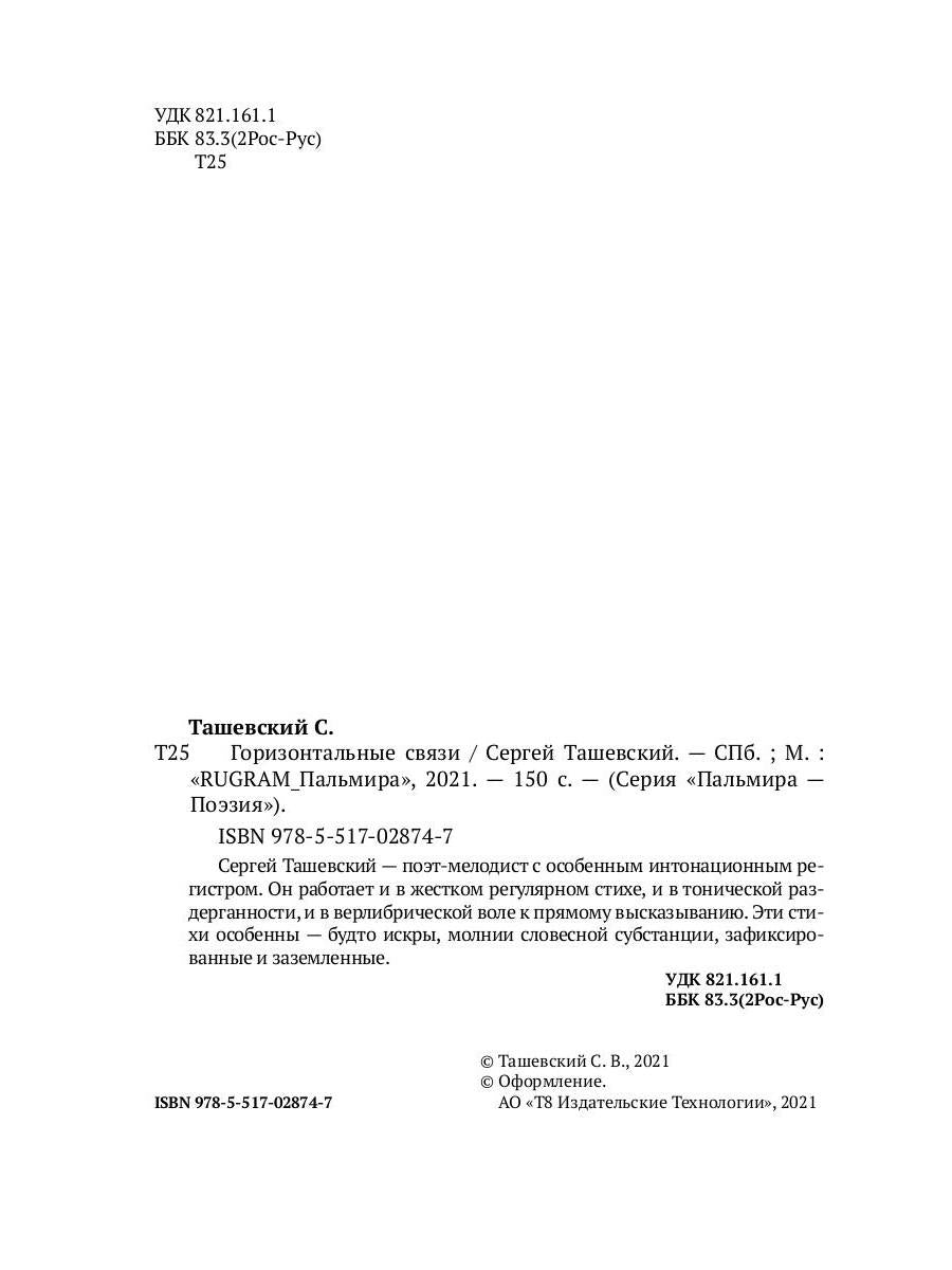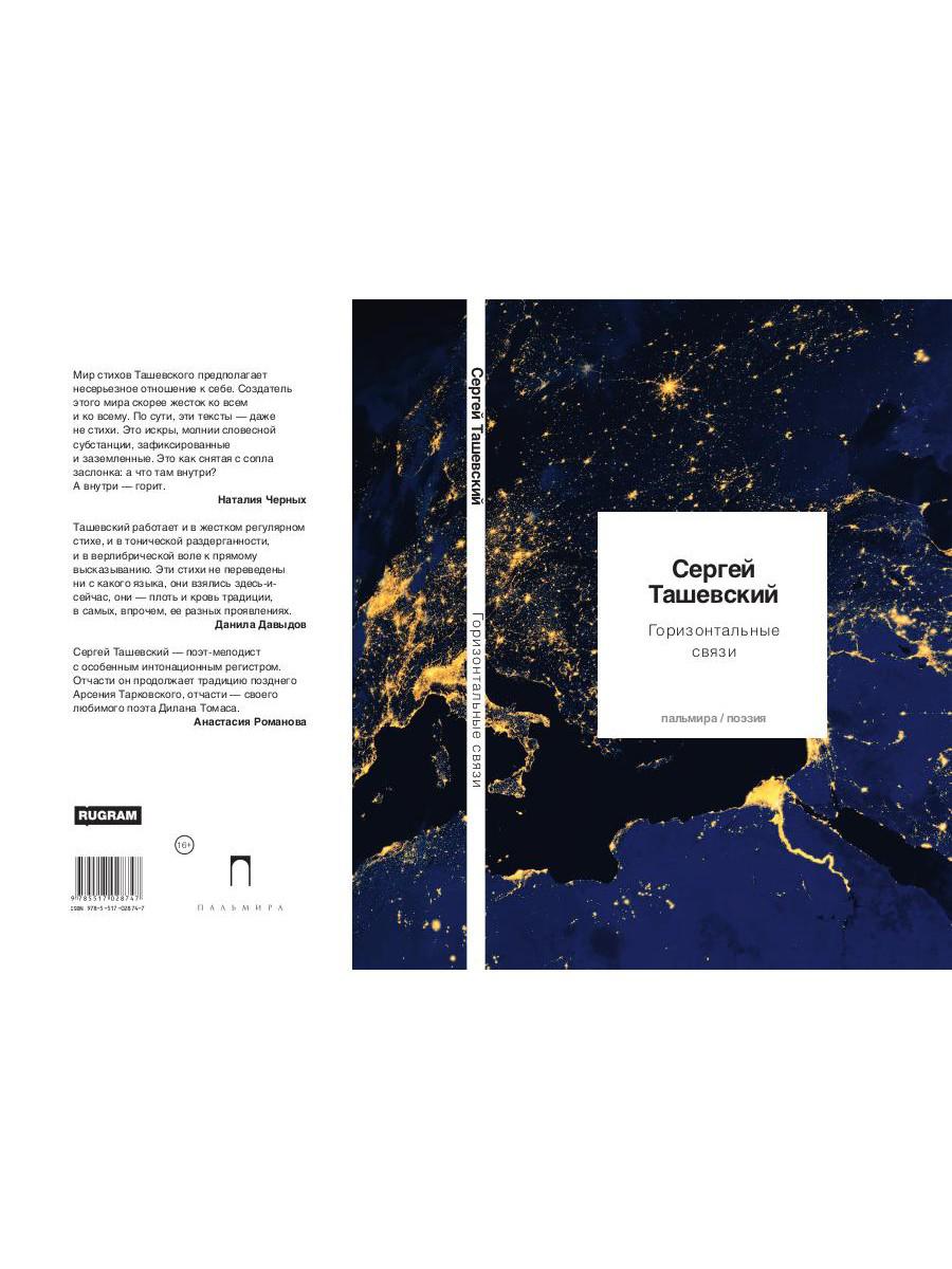 Handling time: 19 days Автор: Ташевский Сергей, «Горизонтальные связи»: Сергей Ташевский — поэт-мелодист с особенным интонационным регистром. Он работает и в жестком регулярном стихе, и в тонической раздерганности, и в верлибрической воле к прямому высказыванию. Эти стихи особенны — будто искры, молнии словесной субстанции, зафиксированные и заземленные.