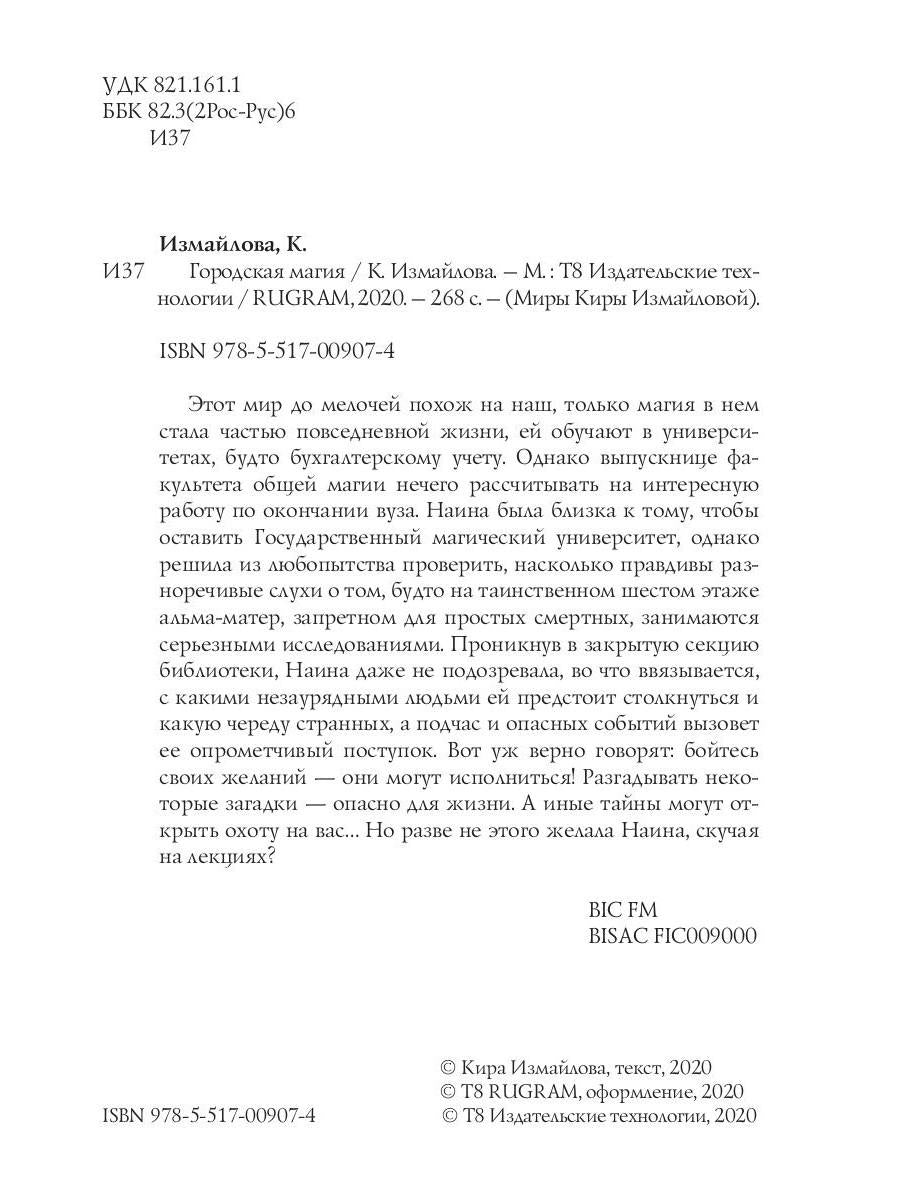 Handling time: 19 days Автор: Измайлова Кира, «Городская магия»: Этот мир до мелочей похож на наш, только магия в нем стала частью повседневной жизни, ей обучают в университетах, будто бухгалтерскому учету. Однако выпускнице факультета общей магии нечего рассчитывать на интересную работу по окончании вуза. Наина была близка к тому, чтобы оставить Государственный магический университет, однако решила из любопытства проверить, насколько правдивы разноречивые слухи о том, будто на таинственном шестом этаже альма-матер, запретном для простых смертных, занимаются серьезными исследованиями. Проникнув в закрытую секцию библиотеки, Наина даже не подозревала, во что ввязывается, с какими незаурядными людьми ей предстоит столкнуться и какую череду странных, а подчас и опасных событий вызовет ее опрометчивый поступок. Вот уж верно говорят: бойтесь своих желаний — они могут исполниться! Разгадывать некоторые загадки — опасно для жизни. А иные тайны могут открыть охоту на вас... Но разве не этого желала Наина, скучая на лекциях?