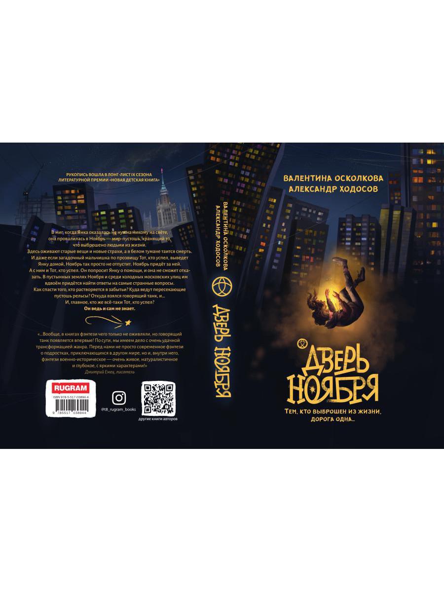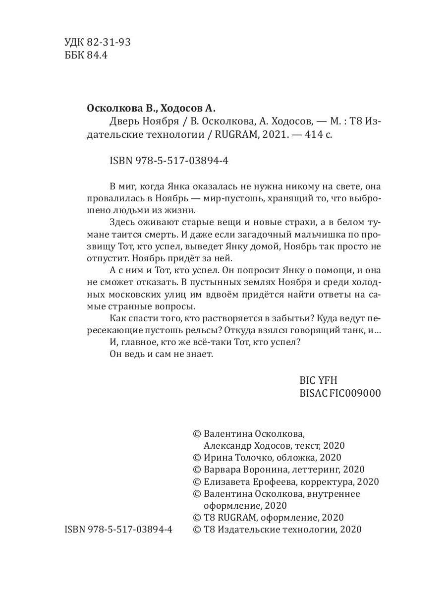 Handling time: 19 days Авторы: Осколкова Валентина, Ходосов Александр, «Дверь Ноября»: В миг, когда Янка оказалась не нужна никому на свете, она провалилась в Ноябрь — мир-пустошь, хранящий то, что выброшено людьми из жизни. Здесь оживают старые вещи и новые страхи, а в белом тумане таится смерть. И даже если загадочный мальчишка по прозвищу Тот, кто успел, выведет Янку домой, Ноябрь так просто не отпустит. Ноябрь придёт за ней. А с ним и Тот, кто успел. Он попросит Янку о помощи, и она не сможет отказать. В пустынных землях Ноября и среди холодных московских улиц им вдвоём придётся найти ответы на самые странные вопросы. Как спасти того, кто растворяется в забытьи? Куда ведут пересекающие пустошь рельсы? Откуда взялся говорящий танк, и... И, главное, кто же всё-таки Тот, кто успел? Он ведь и сам не знает.