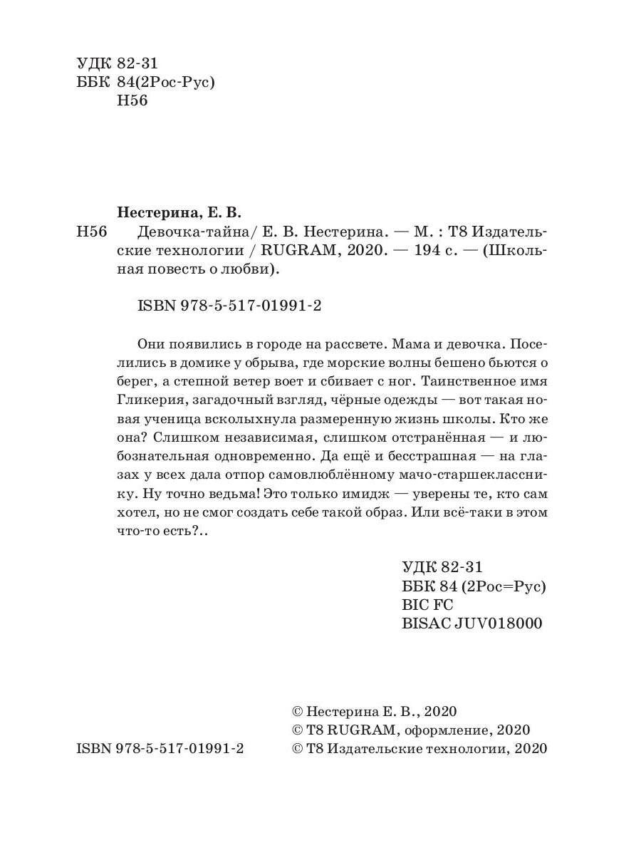 Handling time: 19 days Автор: Нестерина Елена, «Девочка-тайна»: Они появились в городе на рассвете. Мама и девочка. Поселились в домике у обрыва, где морские волны бешено бьются о берег, а степной ветер воет и сбивает с ног. Таинственное имя Гликерия, загадочный взгляд, чёрные одежды — вот такая новая ученица всколыхнула размеренную жизнь школы. Кто же она? Слишком независимая, слишком отстранённая — и любознательная одновременно. Да ещё и бесстрашная — на глазах у всех дала отпор самовлюблённому мачо-старшекласснику. Ну точно ведьма! Это только имидж — уверены те, кто сам хотел, но не смог создать себе такой образ. Или всё-таки в этом что-то есть?..