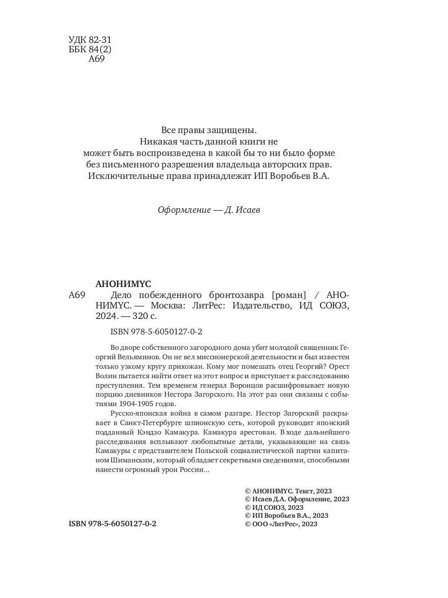 Handling time: 19 days Автор: Анонимус, «Дело побежденного бронтозавра: роман»: Во дворе собственного загородного дома убит молодой священник Георгий Вельяминов. Он не вел миссионерской деятельности и был известен только узкому кругу прихожан. Кому мог помешать отец Георгий? Орест Волин пытается найти ответ на этот вопрос и приступает к расследованию преступления. Тем временем генерал Воронцов расшифровывает новую порцию дневников Нестора Загорского. На этот раз они связаны с событиями 1904–1905 годов. Русско-японская война в самом разгаре. Нестор Загорский раскрывает в Санкт-Петербурге шпионскую сеть, которой руководит японский подданный Кэндзо Камакура. Камакура арестован. В ходе дальнейшего расследования всплывают любопытные детали, указывающие на связь Камакуры с представителем Польской социалистической партии капитаном Шиманским, который обладает секретными сведениями, способными нанести огромный урон России…