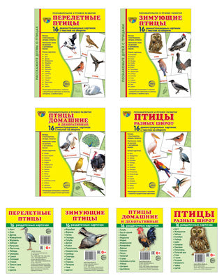 Демонстрационные картинки СУПЕР "Птицы: перелетные, зимующие, домашние и декоративные" (комплект из 7 наборов карточек)