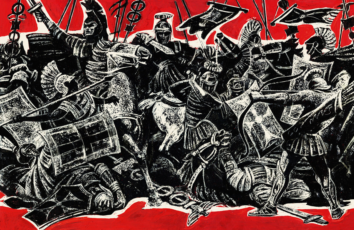 Символизм как художественный приём был выбран и художником Саввой Бродским. Отчаянная борьба умного, благородного, но лишённого прав человека с могущественным государством передана в монументальных образах героев и сюжетных композициях. И неслучайно главной изобразительной темой становится красный фригийский колпак. В древности его носили во Фракии, на родине Спартака, а со времён Великой французской революции он непременный атрибут европейских революционеров и борцов за свободу.