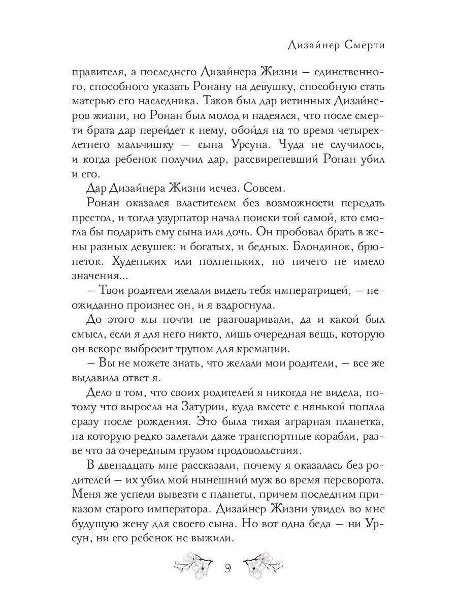 Handling time: 19 days Автор: Соул Диана, «Дизайнер Смерти»: Вот уже на протяжении двадцати пяти лет император Ронан каждый месяц меняет жен, но ни одна из них не смогла дать ему то, что он хочет — наследника. Эсмеральда, как и многие до нее, не желала становиться супругой кровавого узурпатора, но отказать ему невозможно. Все о чем ей остается молить, это не забеременеть от тирана и о легкой смерти через месяц. Но у жизни свои планы, а у Смерти тем более.