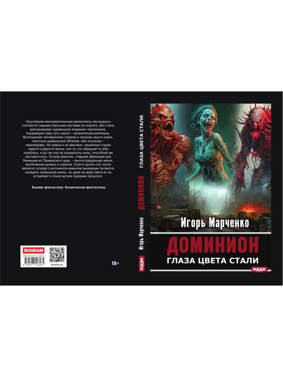 Handling time: 19 days Автор: Марченко Игорь, «Доминион. Кн. 1. Глаза цвета стали»: «Глаза цвета стали» - фантастический роман Игоря Марченко, первая книга цикла «Доминион», жанр боевая фантастика, космическая фантастика. Опустевшие многомиллионные мегаполисы заслуженно считаются самыми опасными местами на планете, ибо стали рассадниками чудовищной эпидемии техногинеза, поразившей саму суть жизни – органические молекулы. Воплощение человеческих страхов и пороков нашло новое, поистине дьявольское обличие, имя которому – некроморфы. Не живые и не мертвые, лишенные страха смерти и радости жизни, они те, кто обращает в себе подобных, и до сих пор не находилось силы, способной им противостоять. Остров Шикотан, ставший убежищем для беженцев из Приморского края, – многострадальная земля, пропитанная кровью и страхом. Спустя десять лет после великого исхода с континента немногие выжившие пытаются наладить привычную жизнь, но даже на краю света их не оставляют в покое жуткие призраки прошлого.