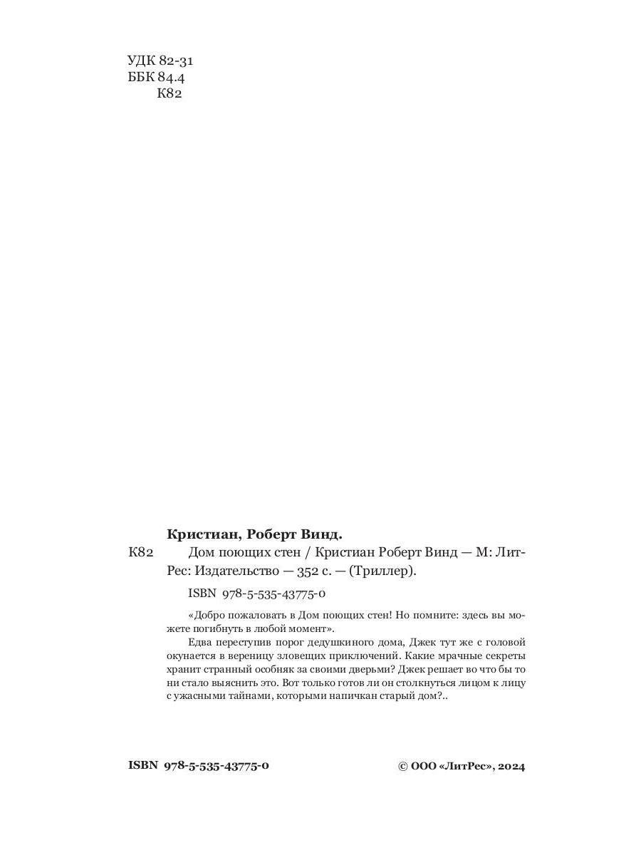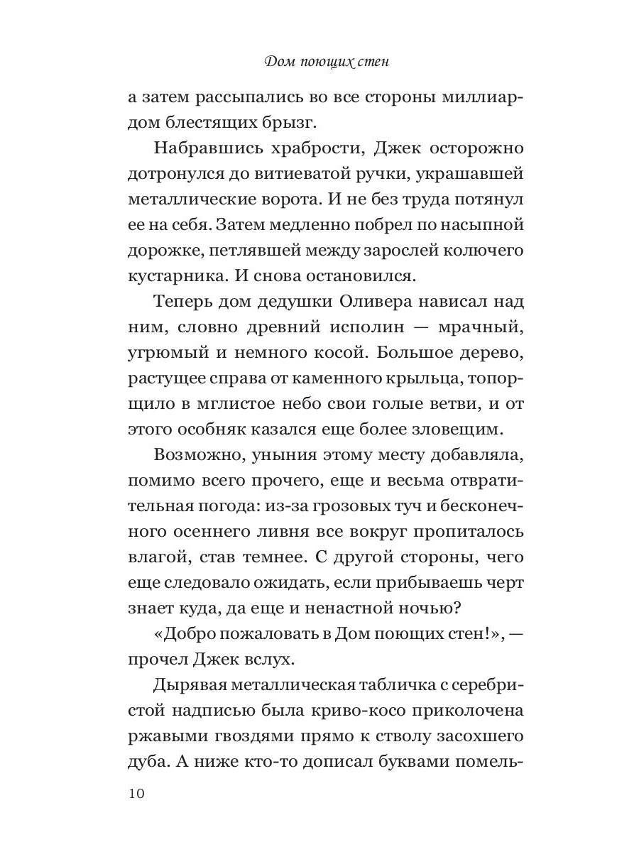 Handling time: 19 days Автор: Винд К. Р., «Дом поющих стен»: «Добро пожаловать в Дом поющих стен! Но помните: здесь вы можете погибнуть в любой момент». Едва переступив порог дедушкиного дома, Джек тут же с головой окунается в вереницу зловещих приключений. Какие мрачные секреты хранит странный особняк за своими дверьми? Джек решает во что бы то ни стало выяснить это. Вот только готов ли он столкнуться лицом к лицу с ужасными тайнами, которыми напичкан старый дом?..