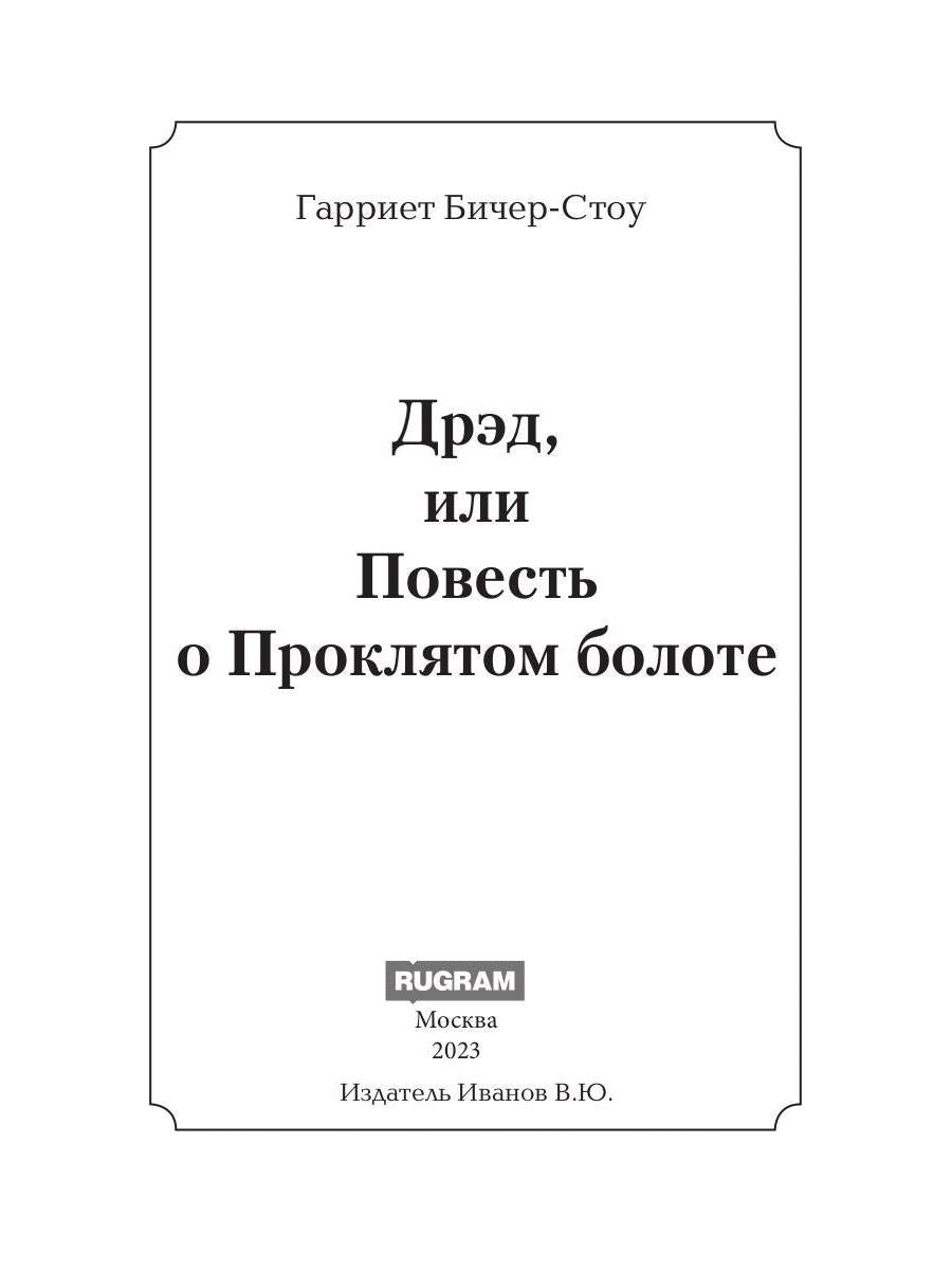 Handling time: 19 days Автор: Бичер-Стоу Г., «Дрэд, или повесть о проклятом болоте: роман»: В романе описан идеальный плантатор Эдвард Клейтон, который обучает рабов грамоте, хочет провести реформы в своем имении и в имении невесты, но под давлением соседей он вынужден отказаться от своих преобразований. Однако не только мирный путь предлагает писательница: негр Дрэд бежит от хозяина, скрывается на болоте, собирает вокруг себя единомышленников и возглавляет восстание беглых рабов. Писательница ищет третий путь.