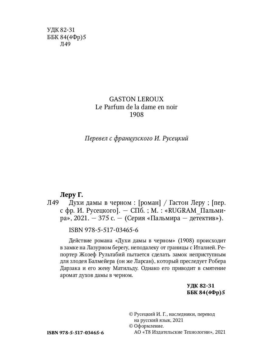 Handling time: 19 days Автор: Леру Гастон, «Духи дамы в черном»: Действие романа «Духи дамы в черном» (1908) происходит в замке на Лазурном берегу, неподалеку от границы с Италией. Репортер Жозеф Рультабий пытается сделать замок неприступным для злодея Балмейера (он же Ларсан), который преследует Робера Дарзака и его жену Матильду. Однако его приводит в смятение аромат духов дамы в черном.
