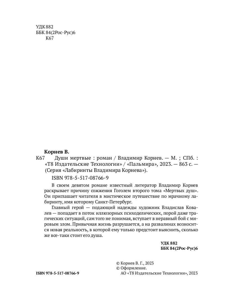 Handling time: 19 days Автор: Корнев Владимир, «Души мертвые»: В своем девятом романе известный литератор Владимир Корнев раскрывает причину сожжения Гоголем второго тома «Мертвых душ». Он приглашает читателя в мистическое путешествие по мрачному лабиринту, имя которому Санкт-Петербург. Главный герой — подающий надежды художник Владислав Ковалев — попадает в поток иллюзорных психоделических, порой даже трагических ситуаций, сам того не понимая, вступает в неравный бой с мировым злом. Привычная жизнь разрушается, а на развалинах возносится новая реальность, в которой ему только предстоит выяснить, сколько же все-таки стоит его душа.