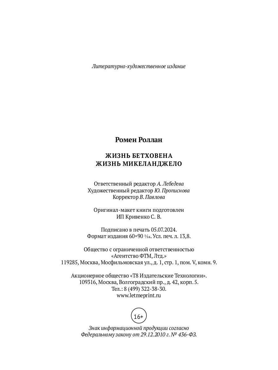 Handling time: 14 days Автор: Роллан Ромен, «Жизнь Бетховена; Жизнь Микеланджело: романы»: Среди произведений французского писателя, лауреата Нобелевской премии по литературе Ромена Роллана (1866–1944) особое место занимает цикл романов «Жизни великих людей» - увлекательное путешествие в мир гениев, оставивших неизгладимый след в истории человечества. В настоящем издании представлены две первые книги цикла, героями которых стали величайшие мастера мировой культуры: Людвиг ван Бетховен и Микеланджело Буонарроти. Опираясь на богатый документальный материал, включающий письма и мемуарные свидетельства, автор подробно описывает их творческий путь - от ранних лет и первых успехов до мировой славы и признания. При этом свои произведения Роллан строит не как исчерпывающие биографии, но как истории драматической и вдохновенной борьбы: Бетховена - с прогрессирующей глухотой, пренебрежением и непониманием современников, Микеланджело - со многими общественными препятствиями и внутренними конфликтами. Писатель убедительно показывает, как, несмотря на испытания и невзгоды, великие деятели искусства смогли сохранить стремление к духовной свободе, ставшее залогом непреходящей значимости их творений.