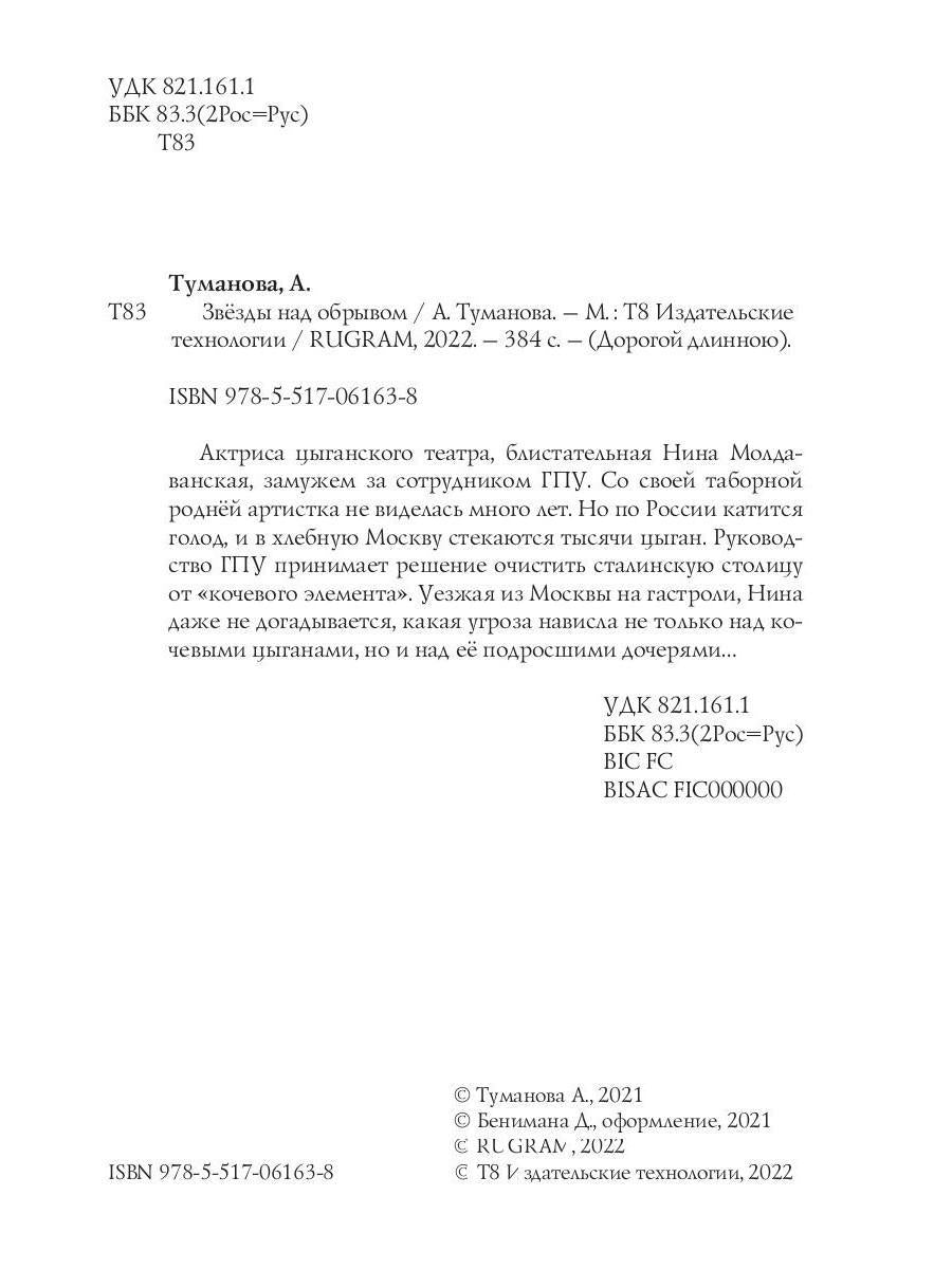 Handling time: 19 days Автор: Туманова Анастасия, «Звезды над обрывом»: Актриса цыганского театра, блистательная Нина Молдаванская, замужем за сотрудником ГПУ. Со своей таборной роднёй артистка не виделась много лет. Но по России катится голод, и в хлебную Москву стекаются тысячи цыган. Руководство ГПУ принимает решение очистить сталинскую столицу от «кочевого элемента». Уезжая из Москвы на гастроли, Нина даже не догадывается, какая угроза нависла не только над кочевыми цыганами, но и над её подросшими дочерями…