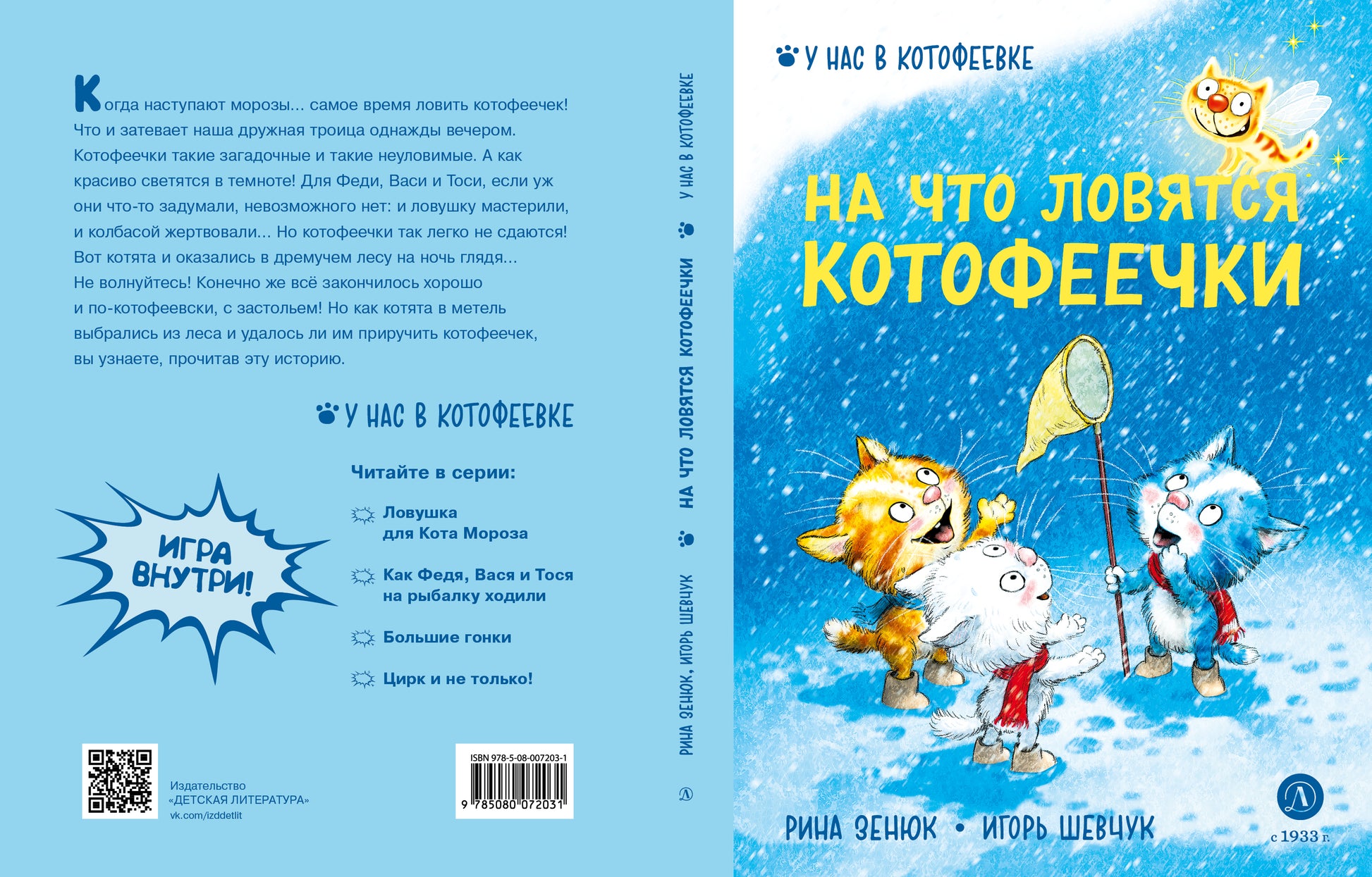Handling time: 19 days Когда наступают морозы… самое время ловить котофеечек! Что и затевает наша дружная троица однажды вечером. Котофеечки такие загадочные и такие неуловимые. А как красиво светятся в темноте! Для Феди, Васи и Тоси, если уж они что-то задумали, невозможного нет: и ловушку мастерили, и колбасой жертвовали… Но котофеечки так легко не сдаются! Вот котята и оказались в дремучем лесу на ночь глядя…Не волнуйтесь! Конечно же всё закончилось хорошо и по-котофеевски, с застольем! Но как котята в метель выбрались из леса и удалось ли им приручить котофеечек, вы узнаете, прочитав эту историю.Для дошкольного возраста. Пять причин купить 1Атмосферное зимнее приключение в Котофеевке от Рины Зенюк! 2Автор текста Игорь Шевчук — сценарист мультсериала Фиксики, мультсериала Смешарики, лауреат премий Михалкова, Чуковского, Серовой. 3Яркие иллюстрации, юмор, увеличенный формат книги, плотная офсетная бумага и крупный шрифт. 4Идеально для чтения детям вслух, но и для самостоятельного чтения ребёнка. 5Настольная игра внутри книги! Весёлый лабиринт для любознательных читателей!
