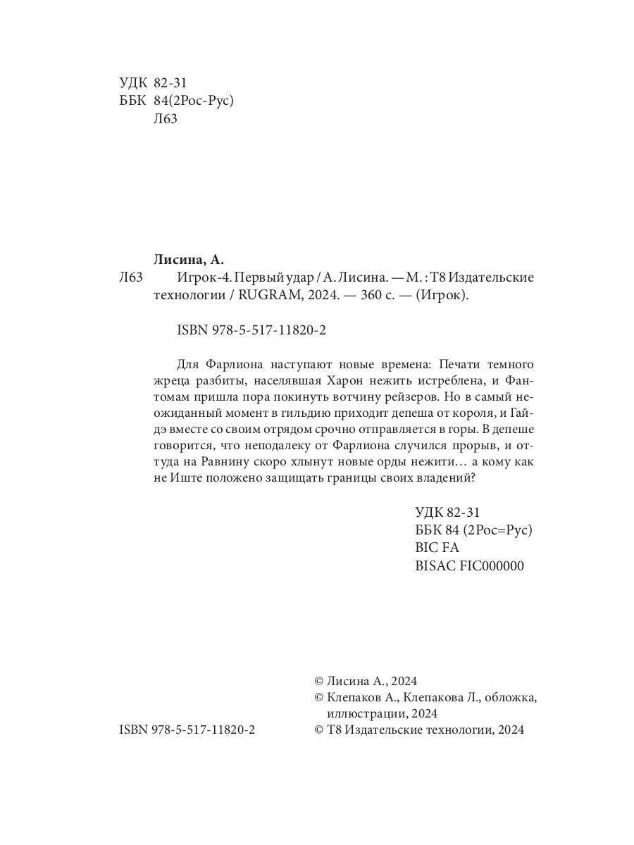 #ASTTD# Search Terms: Лисина А. , Lisina A. , Т8 RUGRAM , Publishing , T8 RUGRAM , Publishing , Игрок , Igrok , 9785517118202 , 978-5-517-11820-2 , 2066610