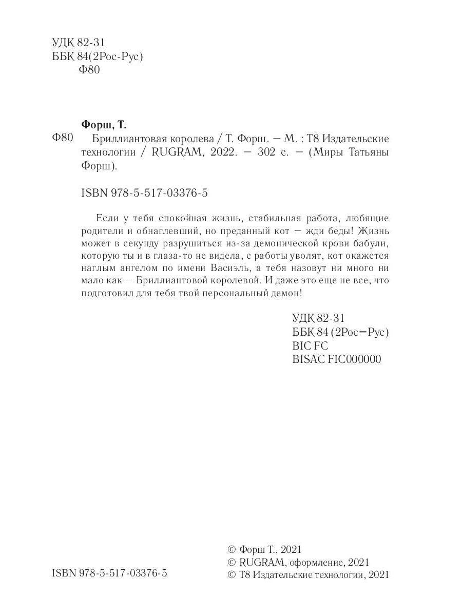 Handling time: 19 days Автор: Форш Татьяна, «Игры богов. Кн. 1: Бриллиантовая королева»: Если у тебя спокойная жизнь, стабильная работа, любящие родители и обнаглевший, но преданный кот - жди беды! Жизнь может в секунду разрушиться из-за демонической крови бабули, которую ты и в глаза-то не видела, с работы уволят, кот окажется наглым ангелом по имени Васиэль, а тебя назовут ни много ни мало как - Бриллиантовой королевой. И даже это еще не все, что подготовил для тебя твой персональный демон!