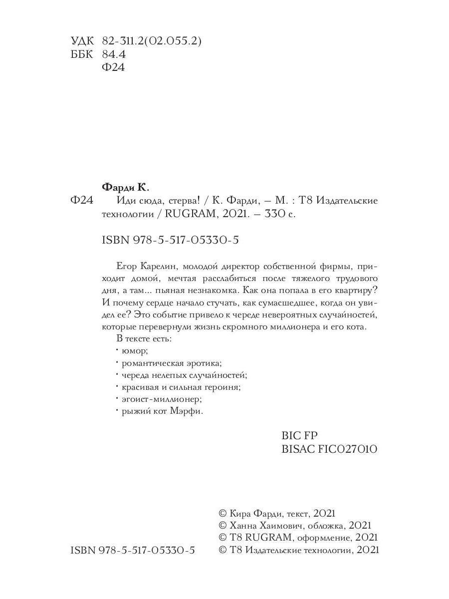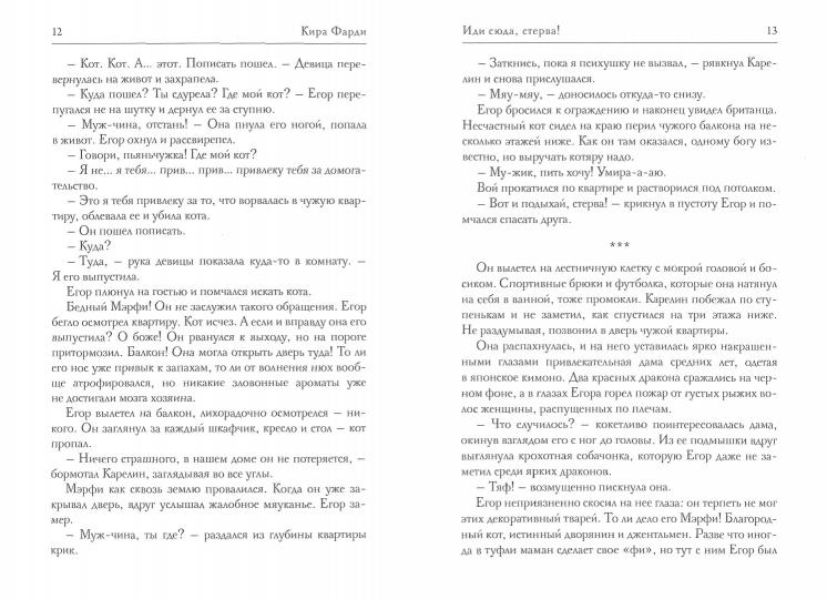 Handling time: 14 days Автор: Фарди Кира, «Иди сюда, стерва!»: Егор Карелин, молодой директор собственной фирмы, приходит домой, мечтая расслабиться после тяжелого трудового дня, а там... пьяная незнакомка. Как она попала в его квартиру? И почему сердце начало стучать, как сумасшедшее, когда он увидел ее? Это событие привело к череде невероятных случайностей, которые перевернули жизнь скромного миллионера и его кота. В тексте есть: • юмор; • романтическая эротика; • череда нелепых случайностей; • красивая и сильная героиня; • эгоист-миллионер; • рыжий кот Мэрфи.