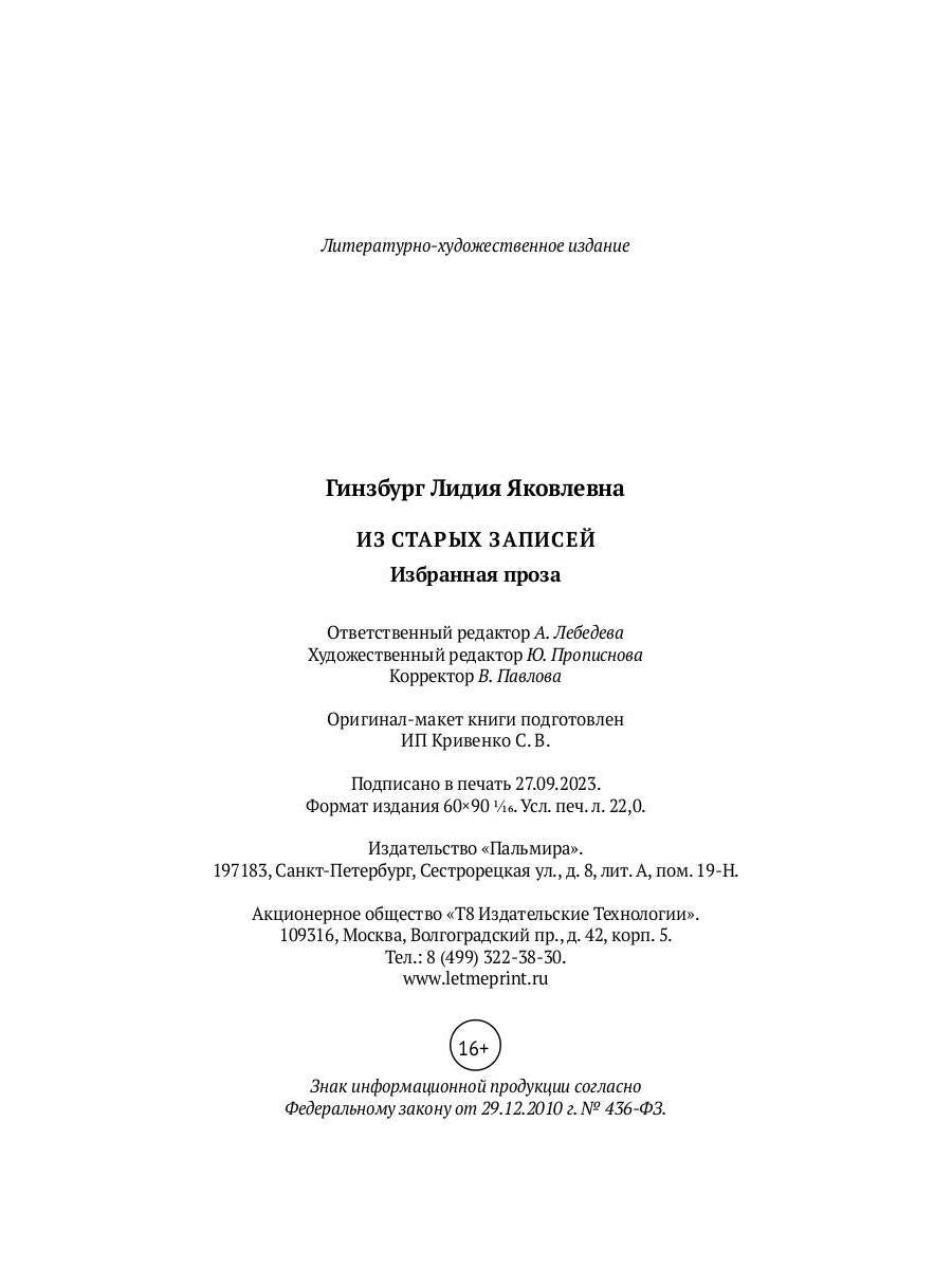 Handling time: 19 days Аннотация к книге "Из старых записей. Избранная проза" Гинзбург Л. Я.:Лидия Гинзбург (1902—1990) известна прежде всего как блестящий литературовед, автор трудов о творчестве Лермонтова и Герцена, книг "О лирике" и "О психологической прозе", "О литературном герое". Однако сама она главным своим достижением считала документальную прозу, которую писала большей частью в стол, без надежды на публикацию. Время распорядилось иначе: в годы перестройки и позднее читателю открылись дневники и записные книжки Гинзбург.В настоящее издание вошли мемуары исследователя, воссоздающие уникальную картину литературной жизни 1920—1980—х годов — воспоминания об Ахматовой, Маяковском, Мандельштаме, Олейникове, Багрицком, Шкловском, Тынянове и других деятелях русской культуры XX столетия, а также "Записки блокадного человека" — свидетельство психологической трансформации человека в нечеловеческих условиях осажденного Ленинграда. Тексты Гинзбург являют удивительный пример интеллектуальной строгости и нравственной стойкости даже в момент крушения гуманистических идеалов. Читать дальше…